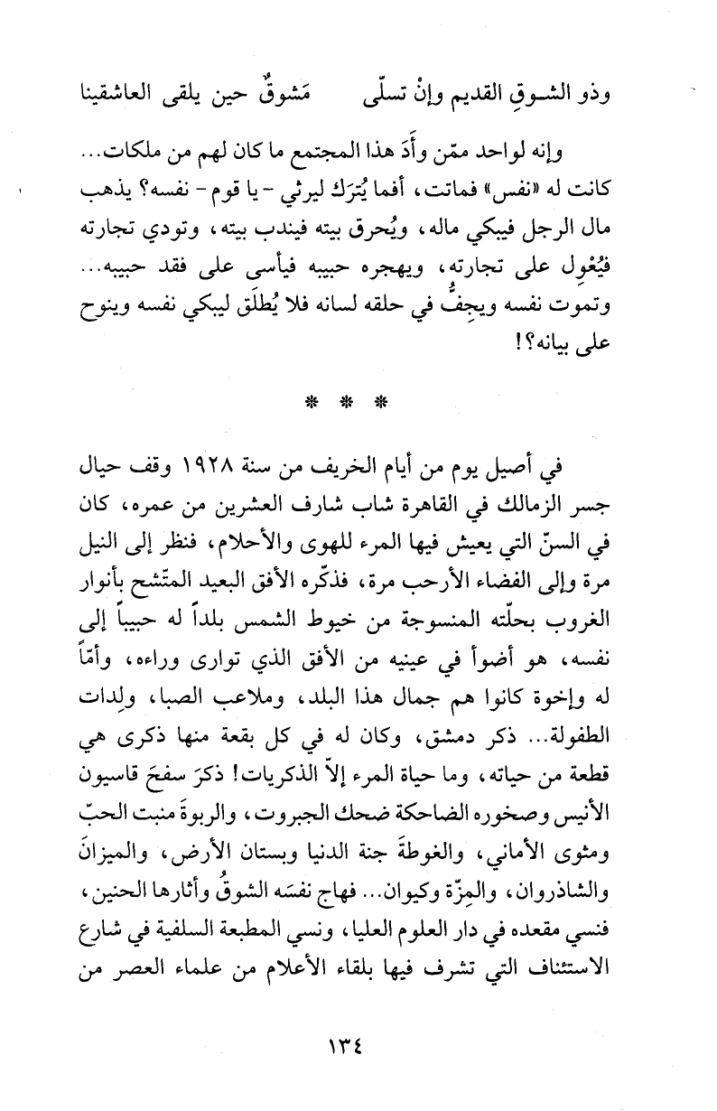في أصيل يوم من أيام الخريف من سنة 1928 وقف حيال جسر الزمالك في القاهرة شاب شارف العشرين من عمره، كان في السنّ التي يعيش فيها المرء للهوى والأحلام، فنظر إلى النيل مرة وإلى الفضاء الأرحب مرة، فذكّره الأفق البعيد المتّشح بأنوار الغروب بحلّته المنسوجة من خيوط الشمس بلداً له حبيباً إلى نفسه، هو أضوأ في عينيه من الأفق الذي توارى وراءه، وأمّاً له وإخوة كانوا هم جمال هذا البلد، وملاعب الصبا، ولِدات الطفولة ... ذكر دمشق، وكان له في كل بقعة منها ذكرى هي قطعة من حياته، وما حياة المرء إلاّ الذكريات! ذكرَ سفحَ قاسيون الأنيس وصخوره الضاحكة ضحك الجبروت، والربوةَ منبت الحبّ ومثوى الأماني، والغوطةَ جنة الدنيا وبستان الأرض، والميزانَ والشاذروان، والمِزّة وكيوان ... فهاج نفسَه الشوقُ وأثارها الحنين، فنسي مقعده في دار العلوم العليا، ونسي المطبعة السلفية في شارع الاستئناف التي تشرف فيها بلقاء الأعلام من علماء العصر من