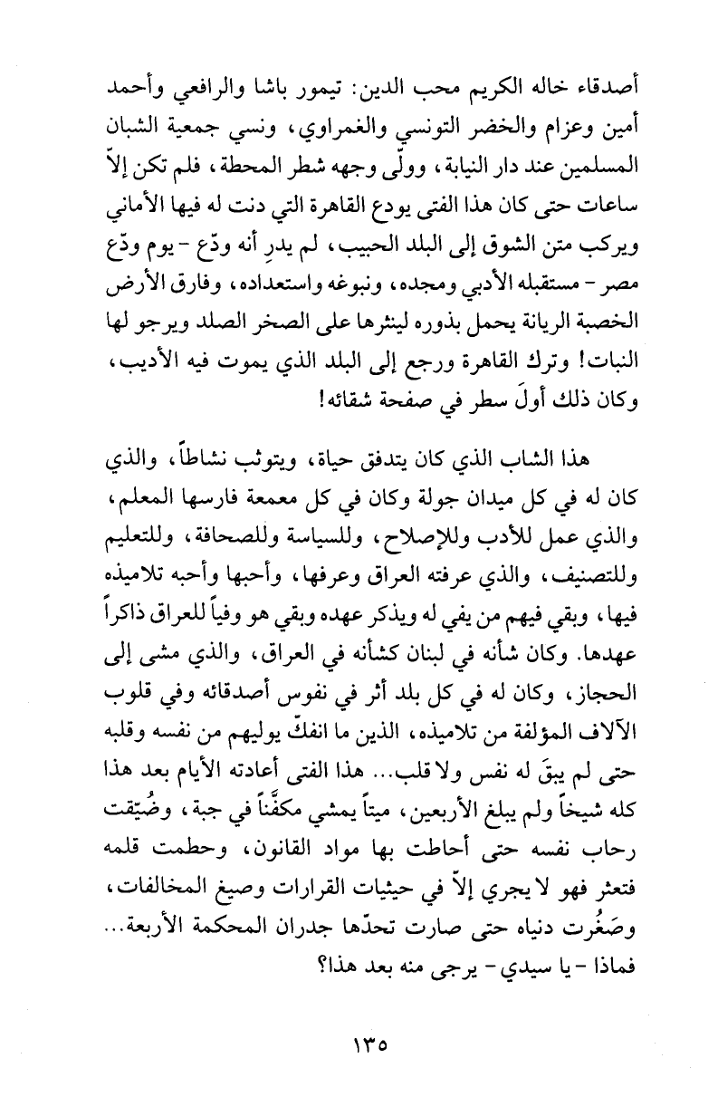 هذا الشاب الذي كان يتدفق حياة، ويتوثب نشاطاً، والذي كان له في كل ميدان جولة وكان في كل معمعة فارسها المعلم، والذي عمل للأدب وللإصلاح، وللسياسة وللصحافة، وللتعليم وللتصنيف، والذي عرفته العراق وعرفها، وأحبها وأحبه تلاميذه فيها، وبقي فيهم من يفي له ويذكر عهده وبقي هو وفياً للعراق ذاكراً عهدها. وكان شأنه في لبنان كشأنه في العراق، والذي مشى إلى الحجاز، وكان له في كل بلد أثر في نفوس أصدقائه وفي قلوب الآلاف المؤلفة من تلاميذه، الذين ما انفكّ يوليهم من نفسه وقلبه حتى لم يبقَ له نفس ولا قلب ... هذا الفتى أعادته الأيام بعد هذا كله شيخاً ولم يبلغ الأربعين، ميتاً يمشي مكفَّناً في جبة، وضُيّقت رحاب نفسه حتى أحاطت بها مواد القانون، وحطمت قلمه فتعثر فهو لا يجري إلاّ في حيثيات القرارات وصيغ المخالفات، وصَغُرت دنياه حتى صارت تحدّها جدران المحكمة الأربعة ... فماذا -يا سيدي- يرجى منه بعد هذا؟