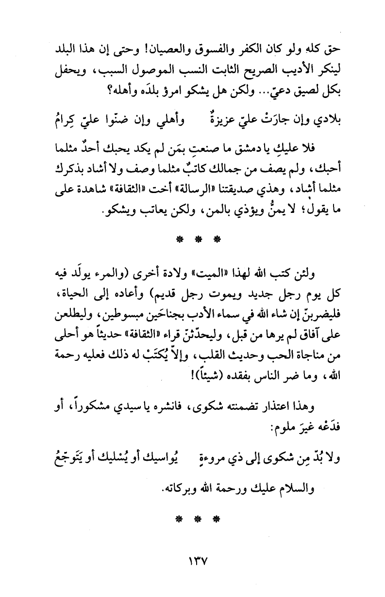 فلا عليكِ يا دمشق ما صنعتِ بمَن لم يكد يحبك أحدٌ مثلما أحبك، ولم يصف من جمالك كاتبٌ مثلما وصف ولا أشاد بذكرك مثلما أشاد، وهذي صديقتنا «الرسالة» أخت «الثقافة» شاهدة على ما يقول؛ لا يمنُّ ويؤذي بالمن، ولكن يعاتب ويشكو.