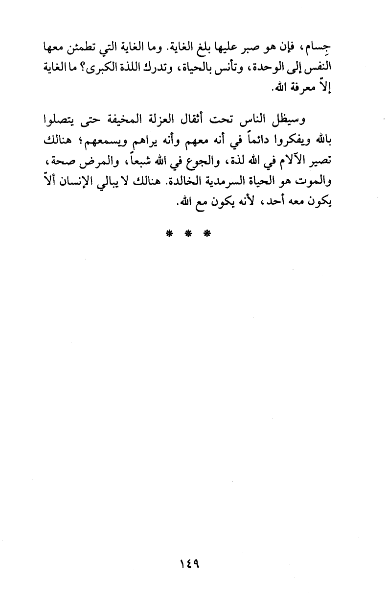 وسيظل الناس تحت أثقال العزلة المخيفة حتى يتصلوا بالله ويفكروا دائماً في أنه معهم وأنه يراهم ويسمعهم؛ هنالك تصير الآلام في الله لذة، والجوع في الله شبعاً، والمرض صحة، والموت هو الحياة السرمدية الخالدة. هنالك لا يبالي الإنسان ألاّ يكون معه أحد، لأنه يكون مع الله.