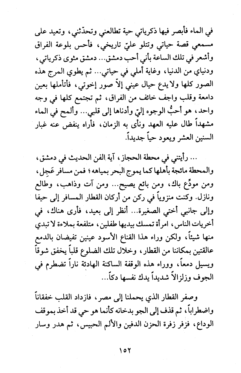 رأيتني في محطة الحجاز، آية الفن الحديث في دمشق، والمحطة مائجة بأهلها كما يموج البحر بمياهه؛ فمن مسافر عَجِل، ومن مودِّع باك، ومن بائع يصيح ... ومن آت وذاهب، وطالع ونازل. وكنت منزوياً في ركن من أركان القطار المسافر إلى حيفا وإلى جانبي أختي الصغيرة ... أنظر إلى بعيد، فأرى هناك، في أخريات الناس، امرأة تمسك بيديها طفلين، متلفعة بملاءة لا تبدي منها شيئاً، ولكن وراء هذا القناع الأسود عينين تفيضان بالدمع عالقتين بمكاننا من القطار، وخلال تلك الضلوع قلباً يخفق شوقاً ويسيل دمعاً، ووراء هذه الوقفة الساكنة الهادئة ناراً تضطرم في الجوف وزلزالاً شديداً يدك نفسها دكاً ...