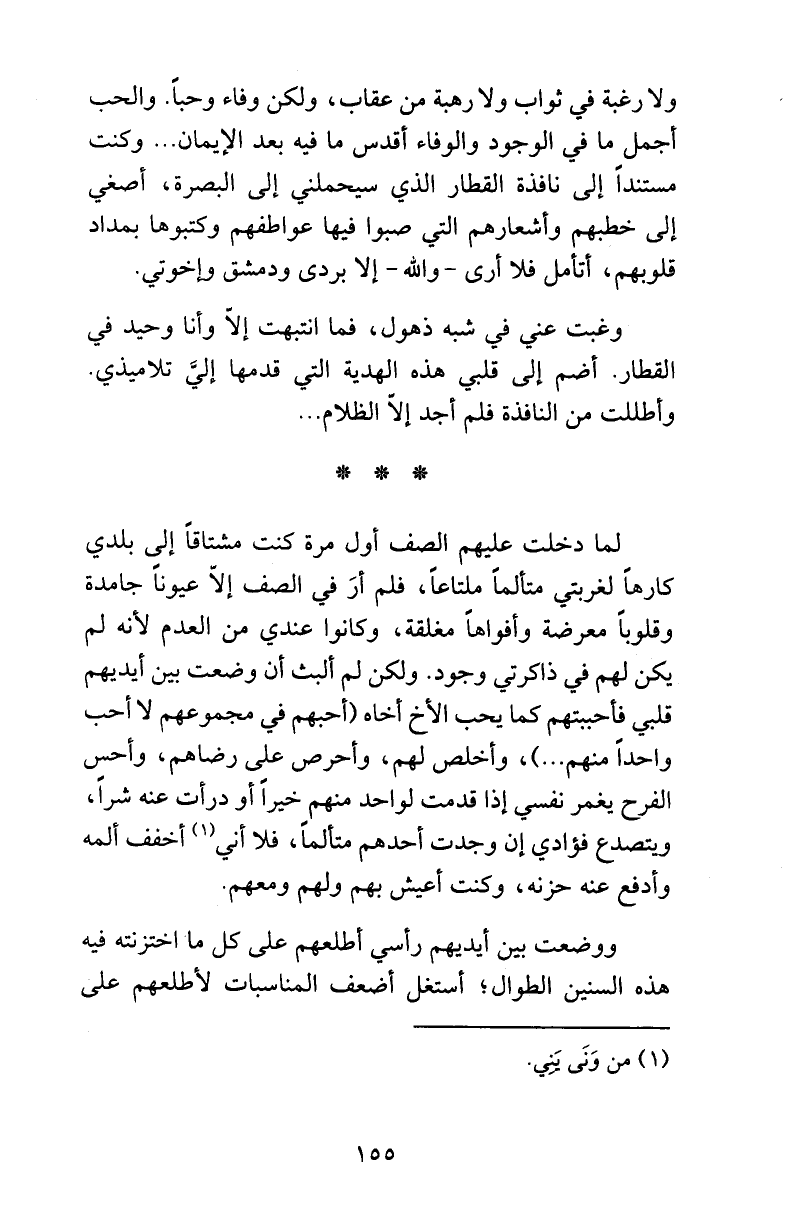 لما دخلت عليهم الصف أول مرة كنت مشتاقاً إلى بلدي كارهاً لغربتي متألماً ملتاعاً، فلم أرَ في الصف إلاّ عيوناً جامدة وقلوباً معرضة وأفواهاً مغلقة، وكانوا عندي من العدم لأنه لم يكن لهم في ذاكرتي وجود. ولكن لم ألبث أن وضعت بين أيديهم قلبي فأحببتهم كما يحب الأخ أخاه (أحبهم في مجموعهم لا أحب واحداً منهم ...)، وأخلص لهم، وأحرص على رضاهم، وأحس الفرح يغمر نفسي إذا قدمت لواحد منهم خيراً أو درأت عنه شراً، ويتصدع فؤادي إن وجدت أحدهم متألماً، فلا أني (¬1) أخفف ألمه وأدفع عنه حزنه، وكنت أعيش بهم ولهم ومعهم.