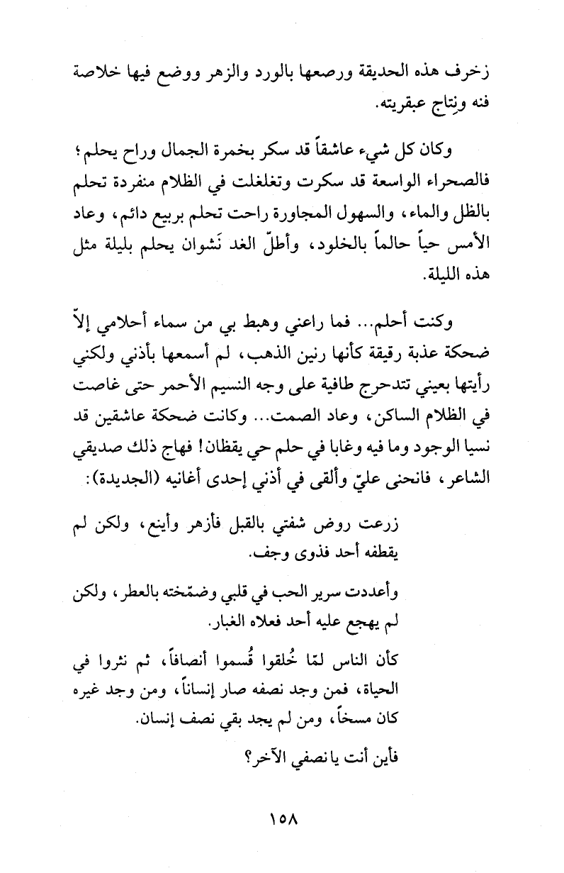 وكان كل شيء عاشقاً قد سكر بخمرة الجمال وراح يحلم؛ فالصحراء الواسعة قد سكرت وتغلغلت في الظلام منفردة تحلم بالظل والماء، والسهول المجاورة راحت تحلم بربيع دائم، وعاد الأمس حياً حالماً بالخلود، وأطلّ الغد نَشوان يحلم بليلة مثل هذه الليلة.