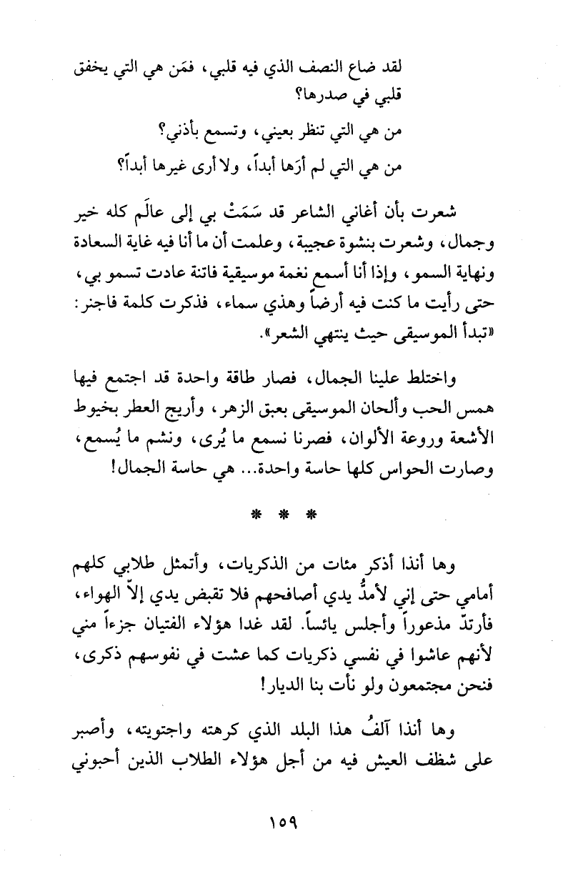 شعرت بأن أغاني الشاعر قد سَمَتْ بي إلى عالَم كله خير وجمال، وشعرت بنشوة عجيبة، وعلمت أن ما أنا فيه غاية السعادة ونهاية السمو، وإذا أنا أسمع نغمة موسيقية فاتنة عادت تسمو بي، حتى رأيت ما كنت فيه أرضاً وهذي سماء، فذكرت كلمة فاجنر: «تبدأ الموسيقى حيث ينتهي الشعر».