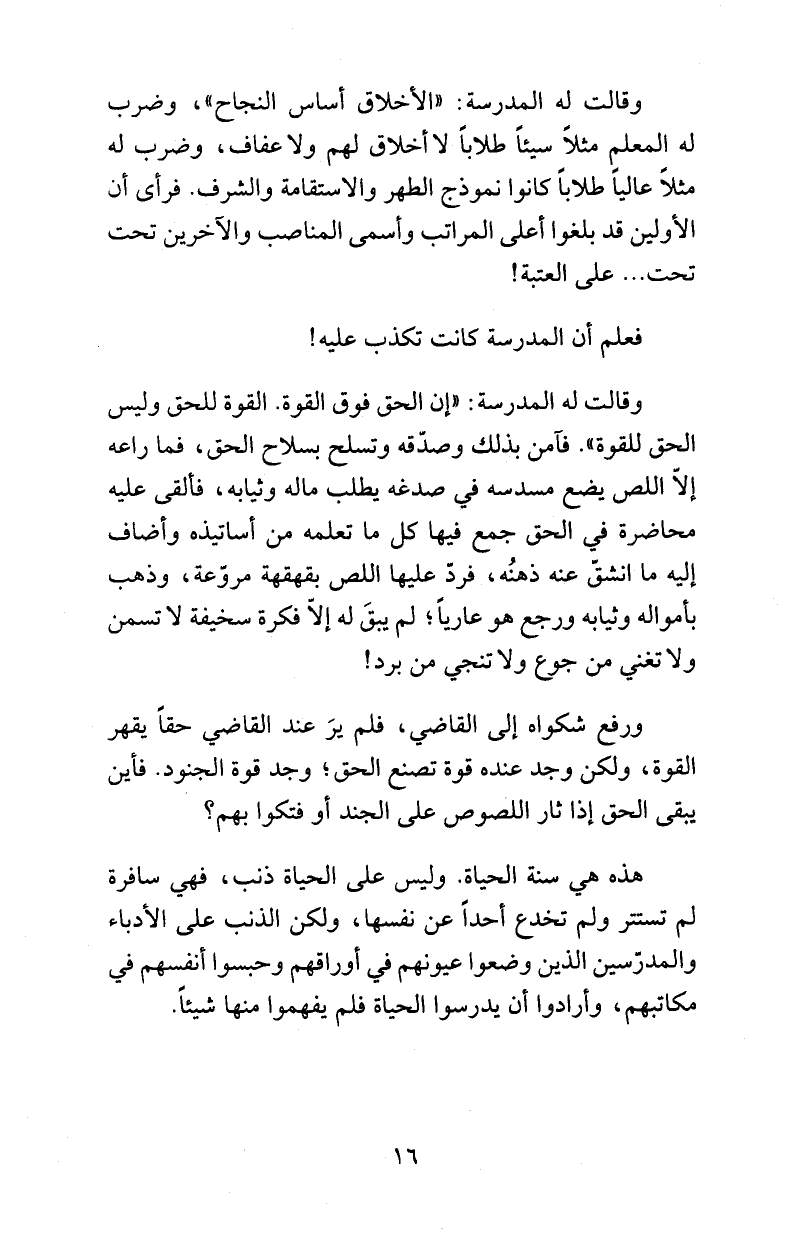 وقالت له المدرسة: «إن الحق فوق القوة. القوة للحق وليس الحق للقوة». فآمن بذلك وصدّقه وتسلح بسلاح الحق، فما راعه إلاّ اللص يضع مسدسه في صدغه يطلب ماله وثيابه، فألقى عليه محاضرة في الحق جمع فيها كل ما تعلمه من أساتيذه وأضاف إليه ما انشقّ عنه ذهنُه، فردّ عليها اللص بقهقهة مروّعة، وذهب بأمواله وثيابه ورجع هو عارياً؛ لم يبقَ له إلاّ فكرة سخيفة لا تسمن ولا تغني من جوع ولا تنجي من برد!