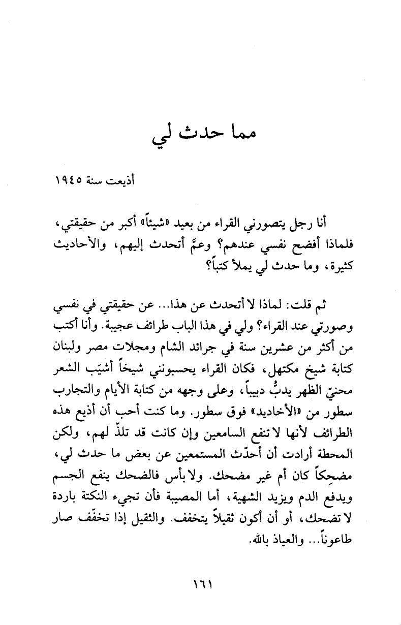 ثم قلت: لماذا لا أتحدث عن هذا ... عن حقيقتي في نفسي وصورتي عند القراء؟ ولي في هذا الباب طرائف عجيبة. وأنا أكتب من أكثر من عشرين سنة في جرائد الشام ومجلات مصر ولبنان كتابة شيخ مكتهل، فكان القراء يحسبونني شيخاً أشيَب الشعر محنيّ الظهر يدبُّ دبيباً، وعلى وجهه من كتابة الأيام والتجارب سطور من «الأخاديد» فوق سطور. وما كنت أحب أن أذيع هذه الطرائف لأنها لا تنفع السامعين وإن كانت قد تلذّ لهم، ولكن المحطة أرادت أن أحدّث المستمعين عن بعض ما حدث لي، مضحِكاً كان أم غير مضحك. ولا بأس فالضحك ينفع الجسم ويدفع الدم ويزيد الشهية، أما المصيبة فأن تجيء النكتة باردة لا تضحك، أو أن أكون ثقيلاً يتخفف. والثقيل إذا تخفّف صار طاعوناً ... والعياذ بالله.