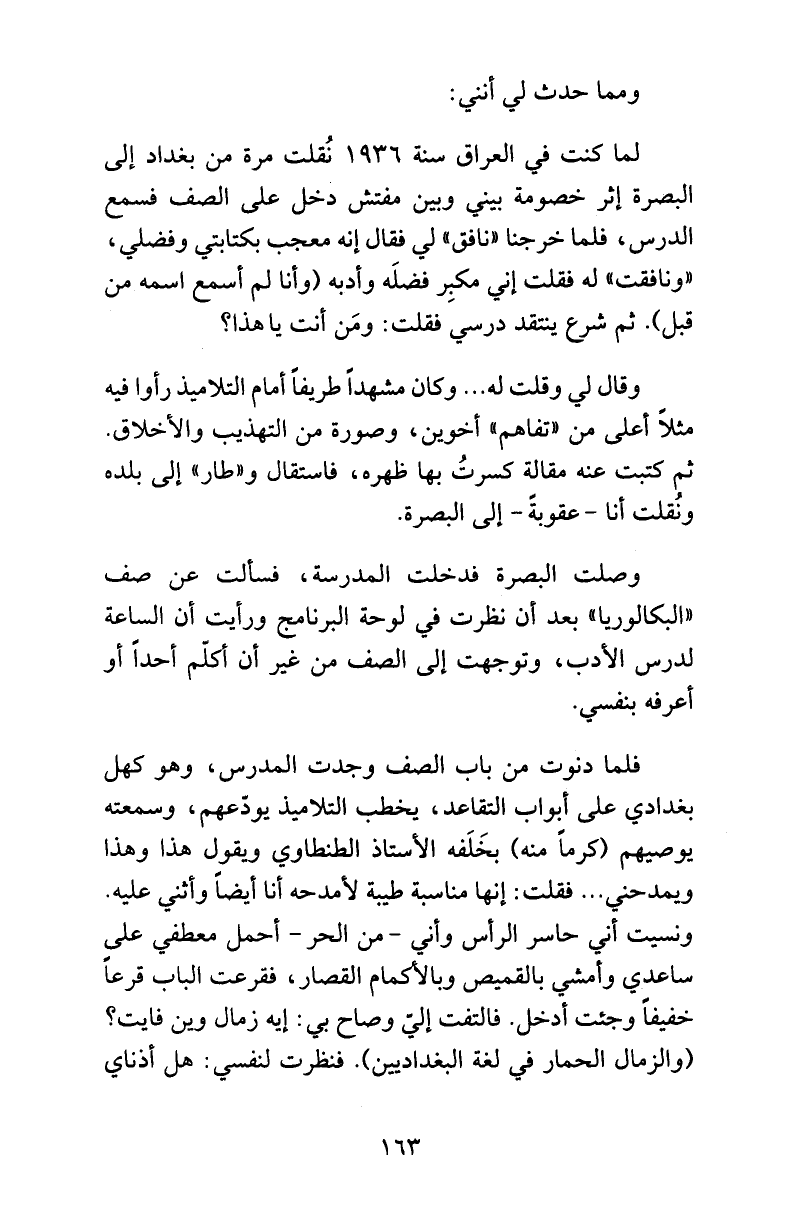 لما كنت في العراق سنة 1936 نُقلت مرة من بغداد إلى البصرة إثر خصومة بيني وبين مفتش دخل على الصف فسمع الدرس، فلما خرجنا «نافق» لي فقال إنه معجب بكتابتي وفضلي، «ونافقت» له فقلت إني مكبِر فضلَه وأدبه (وأنا لم أسمع اسمه من قبل). ثم شرع ينتقد درسي فقلت: ومَن أنت يا هذا؟