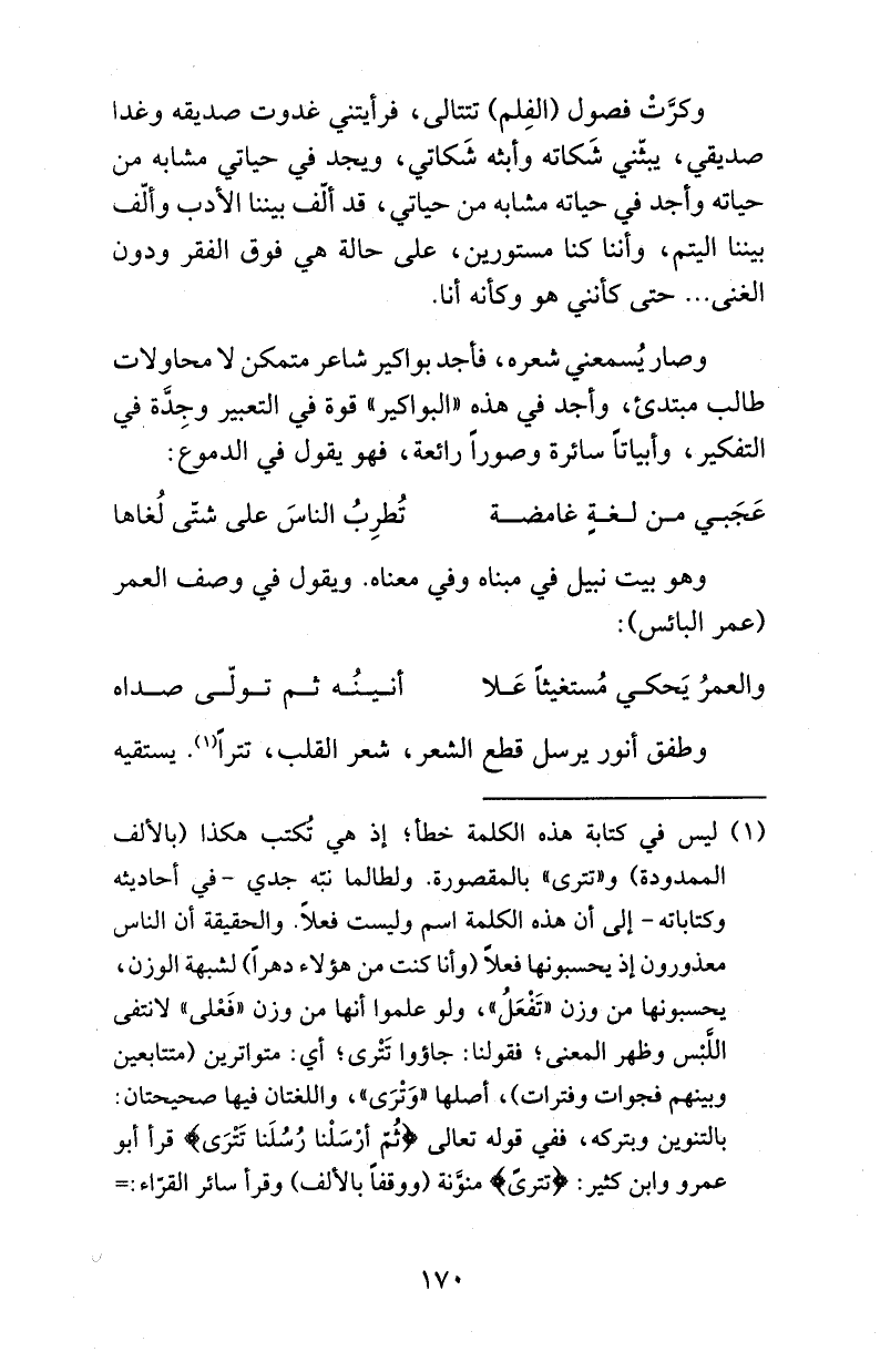 وصار يُسمعني شعره، فأجد بواكير شاعر متمكن لا محاولات طالب مبتدئ، وأجد في هذه «البواكير» قوة في التعبير وجِدَّة في التفكير، وأبياتاً سائرة وصوراً رائعة، فهو يقول في الدموع: