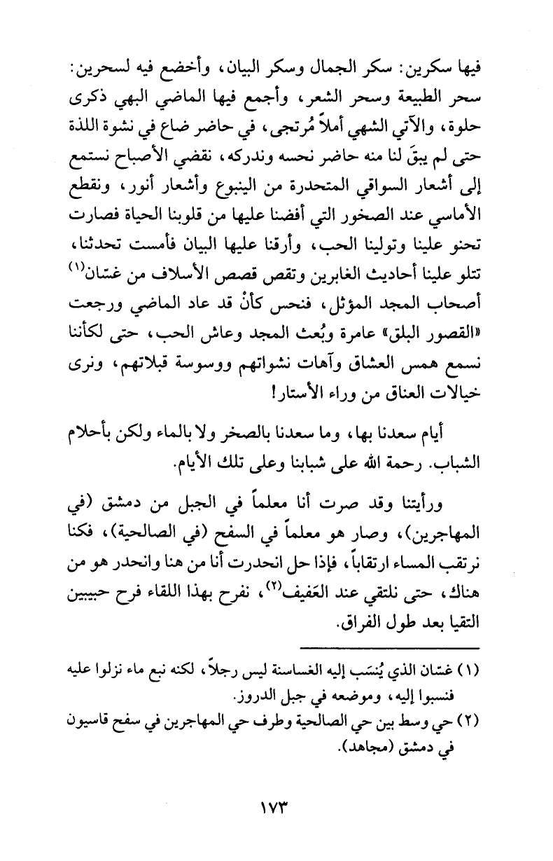 ورأيتنا وقد صرت أنا معلماً في الجبل من دمشق (في المهاجرين)، وصار هو معلماً في السفح (في الصالحية)، فكنا نرتقب المساء ارتقاباً، فإذا حل انحدرت أنا من هنا وانحدر هو من هناك، حتى نلتقي عند العَفيف (¬2)، نفرح بهذا اللقاء فرح حبيبين التقيا بعد طول الفراق.