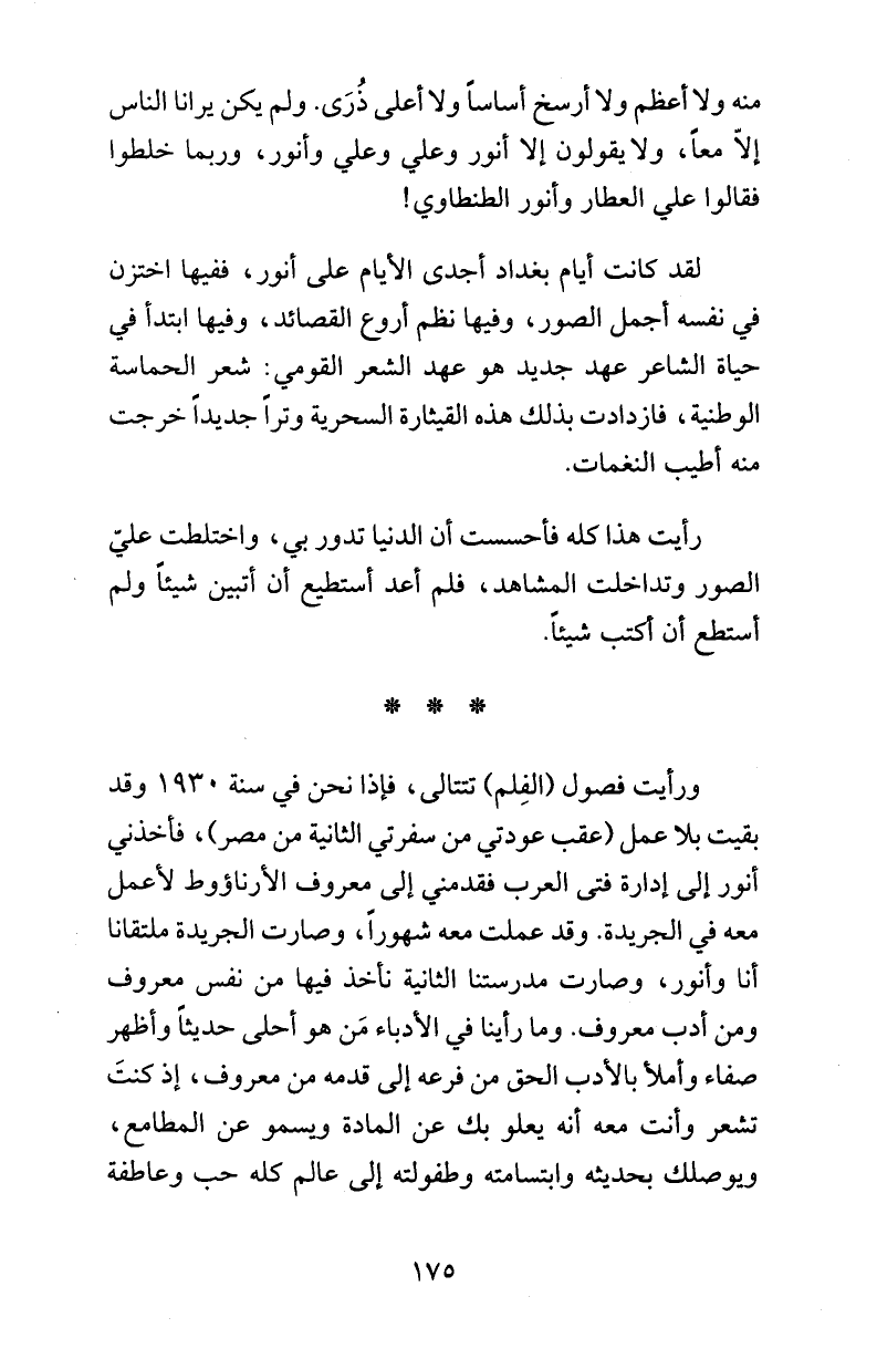 ورأيت فصول (الفِلم) تتتالى، فإذا نحن في سنة 1930 وقد بقيت بلا عمل (عقب عودتي من سفرتي الثانية من مصر)، فأخذني أنور إلى إدارة فتى العرب فقدمني إلى معروف الأرناؤوط لأعمل معه في الجريدة. وقد عملت معه شهوراً، وصارت الجريدة ملتقانا أنا وأنور، وصارت مدرستنا الثانية نأخذ فيها من نفس معروف ومن أدب معروف. وما رأينا في الأدباء مَن هو أحلى حديثاً وأظهر صفاء وأملأ بالأدب الحق من فرعه إلى قدمه من معروف، إذ كنتَ تشعر وأنت معه أنه يعلو بك عن المادة ويسمو عن المطامع، ويوصلك بحديثه وابتسامته وطفولته إلى عالم كله حب وعاطفة