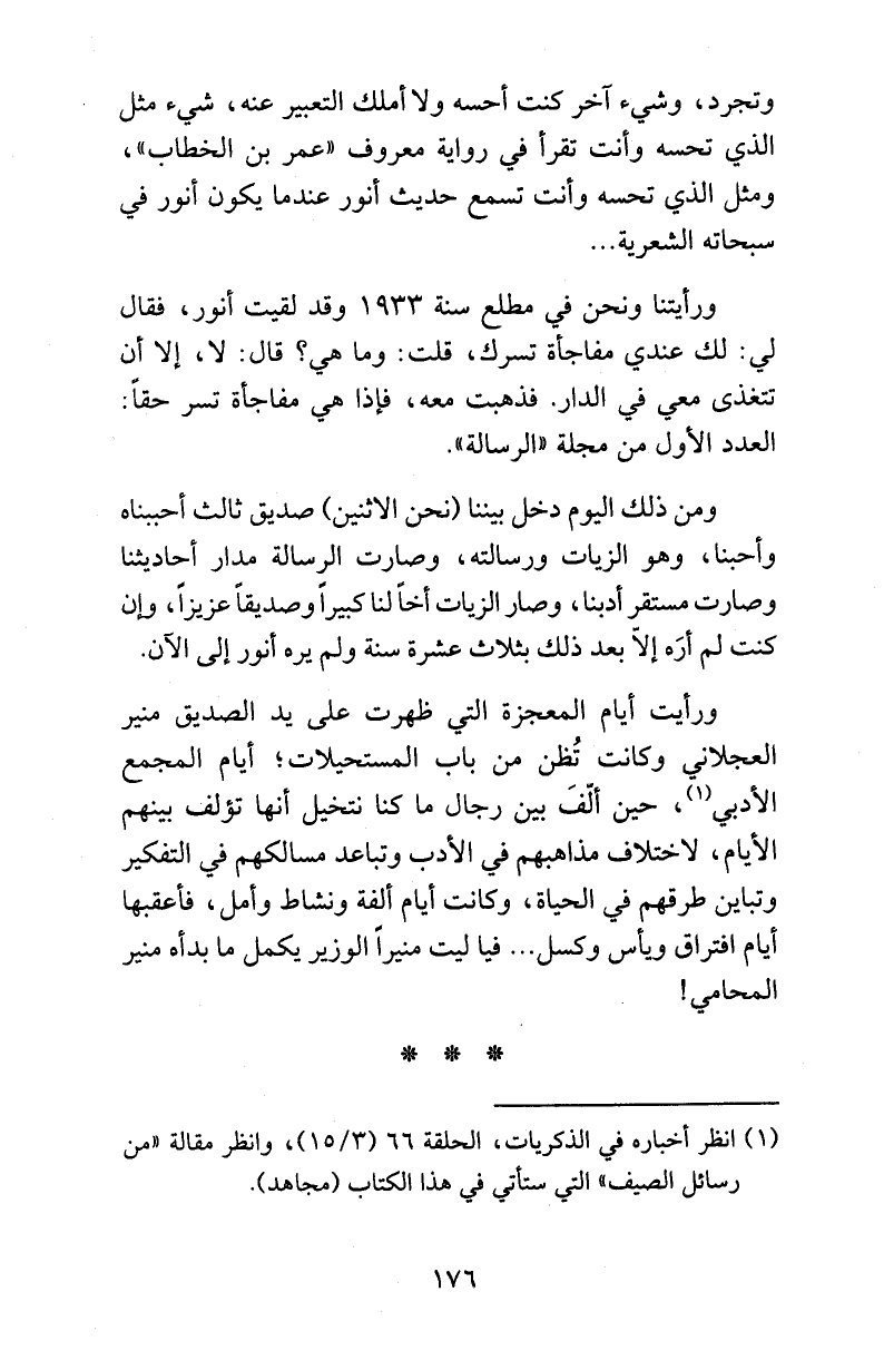 ومن ذلك اليوم دخل بيننا (نحن الاثنين) صديق ثالث أحببناه وأحبنا، وهو الزيات ورسالته، وصارت الرسالة مدار أحاديثنا وصارت مستقر أدبنا، وصار الزيات أخاً لنا كبيراً وصديقاً عزيزاً، وإن كنت لم أرَه إلاّ بعد ذلك بثلاث عشرة سنة ولم يره أنور إلى الآن.