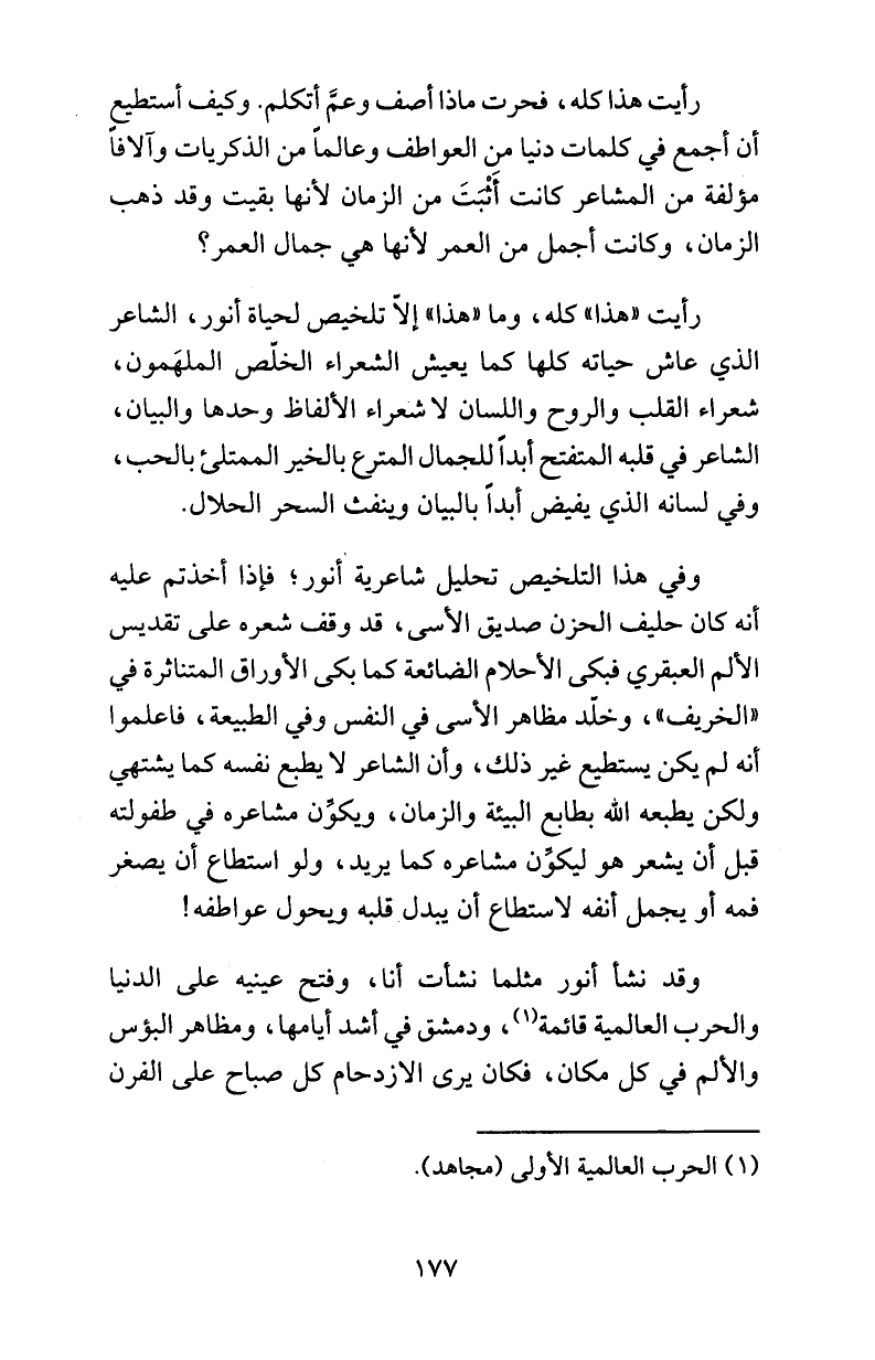 رأيت «هذا» كله، وما «هذا» إلاّ تلخيص لحياة أنور، الشاعر الذي عاش حياته كلها كما يعيش الشعراء الخلّص الملهَمون، شعراء القلب والروح واللسان لا شعراء الألفاظ وحدها والبيان، الشاعر في قلبه المتفتح أبداً للجمال المترع بالخير الممتلئ بالحب، وفي لسانه الذي يفيض أبداً بالبيان وينفث السحر الحلال.