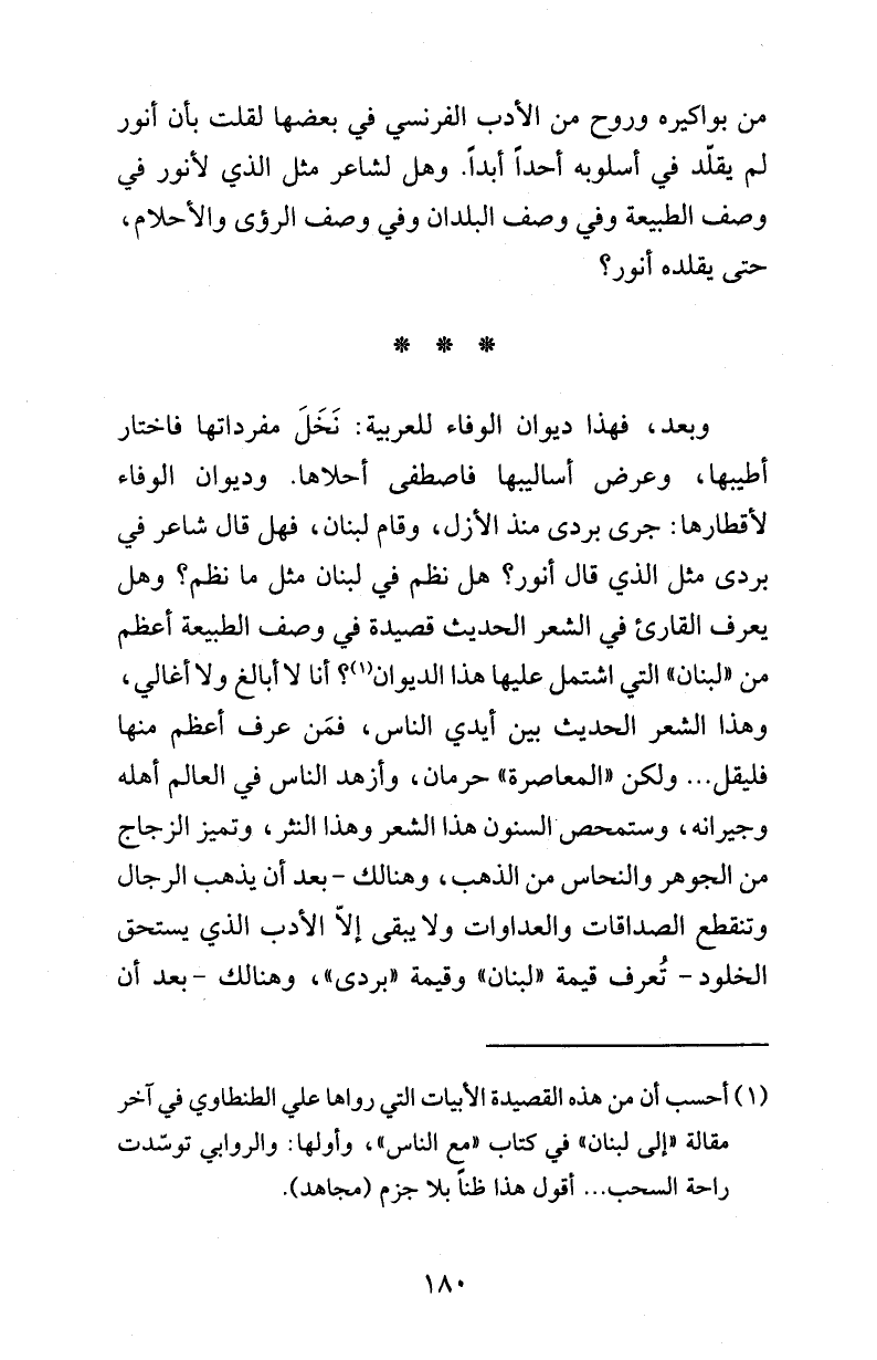 وبعد، فهذا ديوان الوفاء للعربية: نَخَلَ مفرداتها فاختار أطيبها، وعرض أساليبها فاصطفى أحلاها. وديوان الوفاء لأقطارها: جرى بردى منذ الأزل، وقام لبنان، فهل قال شاعر في بردى مثل الذي قال أنور؟ هل نظم في لبنان مثل ما نظم؟ وهل يعرف القارئ في الشعر الحديث قصيدة في وصف الطبيعة أعظم من «لبنان» التي اشتمل عليها هذا الديوان (¬1)؟ أنا لا أبالغ ولا أغالي، وهذا الشعر الحديث بين أيدي الناس، فمَن عرف أعظم منها فليقل ... ولكن «المعاصرة» حرمان، وأزهد الناس في العالم أهله وجيرانه، وستمحص السنون هذا الشعر وهذا النثر، وتميز الزجاج من الجوهر والنحاس من الذهب، وهنالك -بعد أن يذهب الرجال وتنقطع الصداقات والعداوات ولا يبقى إلاّ الأدب الذي يستحق الخلود- تُعرف قيمة «لبنان» وقيمة «بردى»، وهنالك -بعد أن