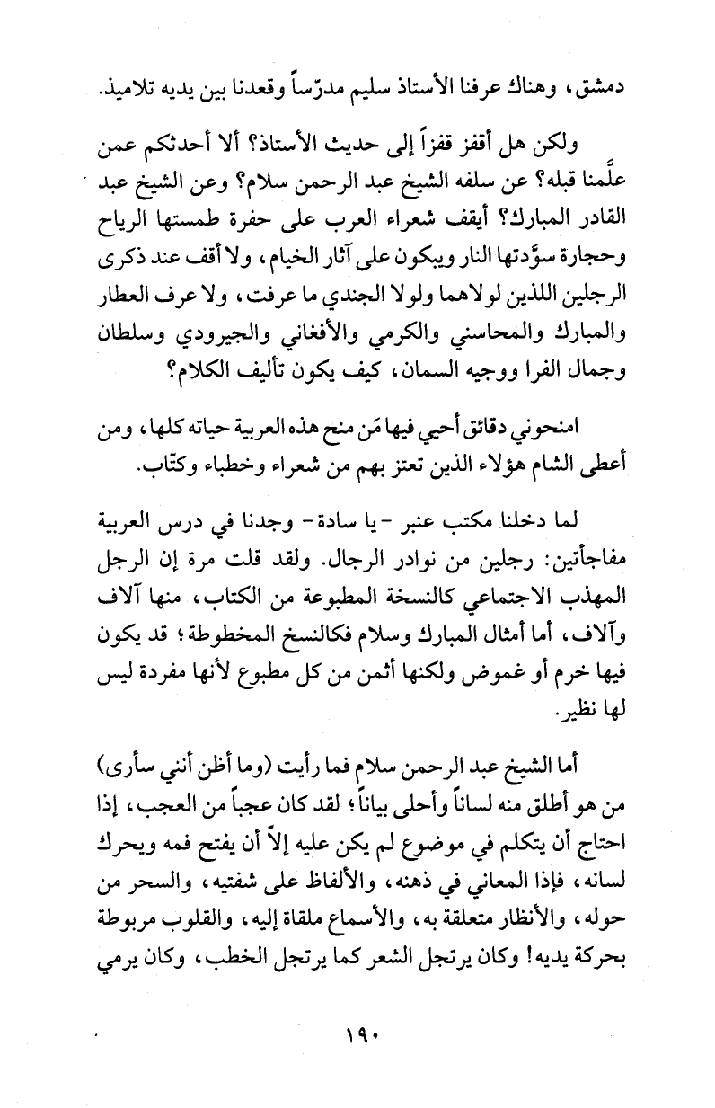 ولكن هل أقفز قفزاً إلى حديث الأستاذ؟ ألا أحدثكم عمن علَّمنا قبله؟ عن سلفه الشيخ عبد الرحمن سلام؟ وعن الشيخ عبد القادر المبارك؟ أيقف شعراء العرب على حفرة طمستها الرياح وحجارة سوَّدتها النار ويبكون على آثار الخيام، ولا أقف عند ذكرى الرجلين اللذين لولاهما ولولا الجندي ما عرفت، ولا عرف العطار والمبارك والمحاسني والكرمي والأفغاني والجيرودي وسلطان وجمال الفرا ووجيه السمان، كيف يكون تأليف الكلام؟