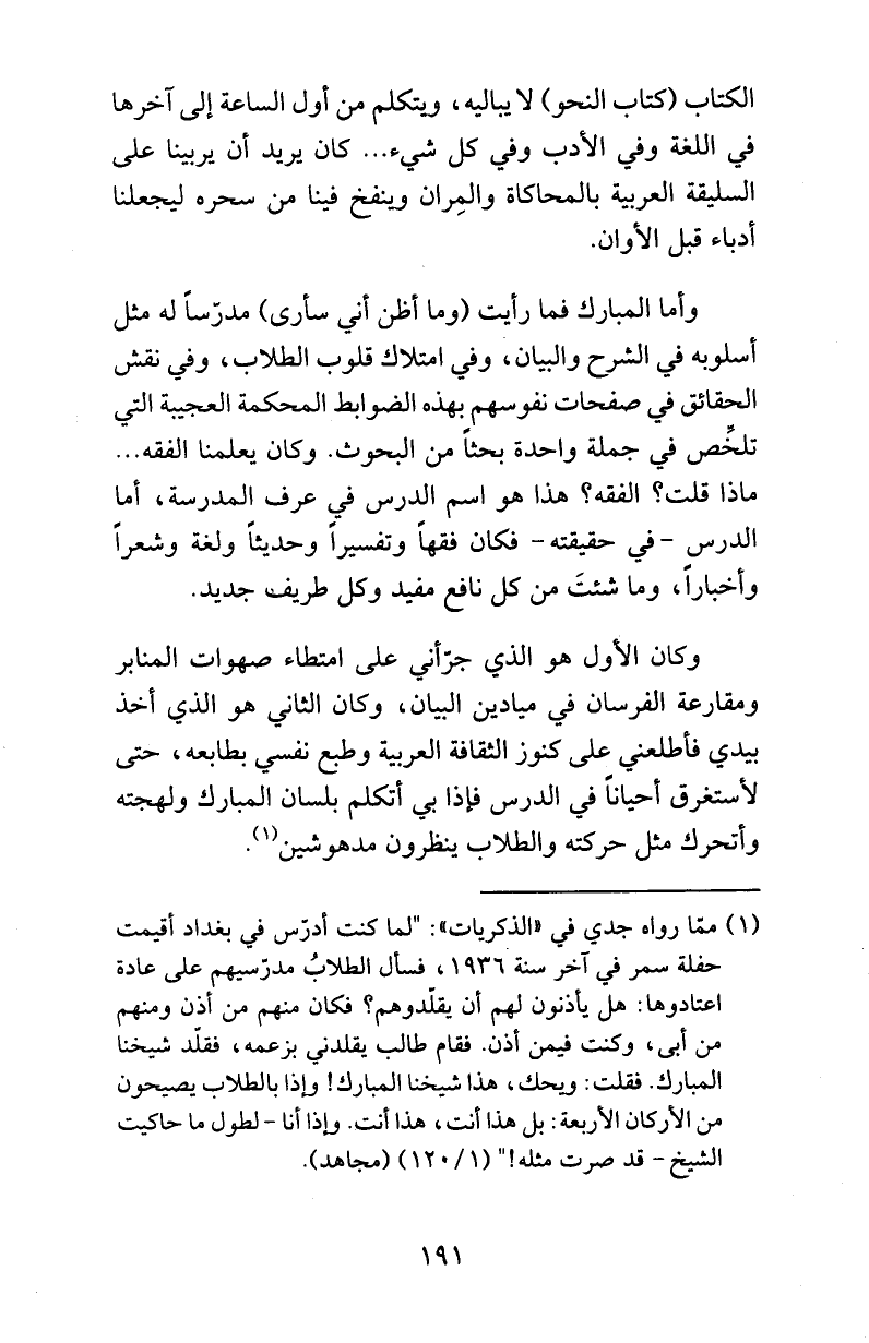الكتاب (كتاب النحو) لا يباليه، ويتكلم من أول الساعة إلى آخرها في اللغة وفي الأدب وفي كل شيء ... كان يريد أن يربينا على السليقة العربية بالمحاكاة والمِران وينفخ فينا من سحره ليجعلنا أدباء قبل الأوان.