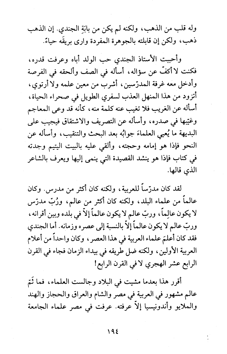 وأحببت الأستاذ الجندي حب الولد أباه وعرفت قدره، فكنت لا أكفّ عن سؤاله، أسأله في الصف وألحقه في الفرصة وأدخل معه غرفة المدرّسين، أشرب من معين علمه ولا أرتوي، أتزود من هذا المنهل العذب لسفري الطويل في صحراء الحياة، أسأله عن الغريب فلا تغيب عنه كلمة منه، كأنه قد وعى المعاجم وغيّبها في صدره، وأسأله عن التصريف والاشتقاق فيجيب على البديهة ما يُعيي العلماءَ جوابُه بعد البحث والتنقيب، وأسأله عن النحو فإذا هو إمامه وحجته، وألقي عليه بالبيت اليتيم وجدته في كتاب فإذا هو ينشد القصيدة التي ينمى إليها ويعرف بالشاعر الذي قالها.
