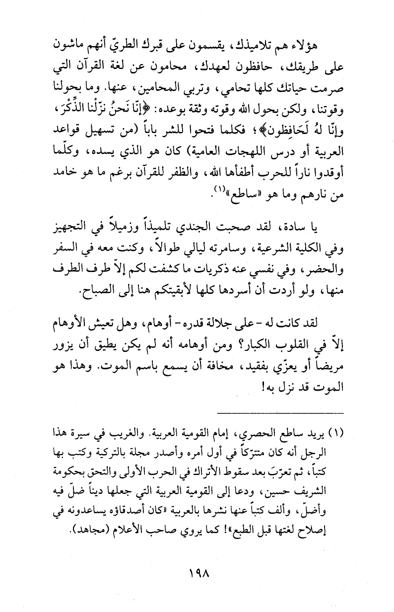 (¬1) يريد ساطع الحصري، إمام القومية العربية. والغريب في سيرة هذا الرجل أنه كان متترّكاً في أول أمره وأصدر مجلة بالتركية وكتب بها كتباً، ثم تعرّبَ بعد سقوط الأتراك في الحرب الأولى والتحق بحكومة الشريف حسين، ودعا إلى القومية العربية التي جعلها ديناً ضلّ فيه وأضلّ، وألف كتباً عنها نشرها بالعربية «كان أصدقاؤه يساعدونه في إصلاح لغتها قبل الطبع»! كما يروي صاحب الأعلام (مجاهد).