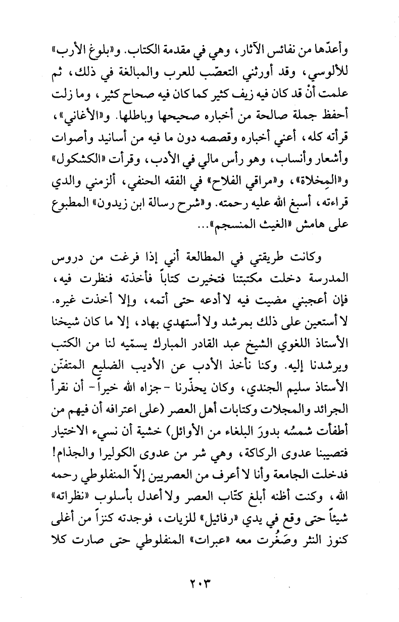 وأعدّها من نفائس الآثار، وهي في مقدمة الكتاب. و «بلوغ الأرب» للألوسي، وقد أورثني التعصّب للعرب والمبالغة في ذلك، ثم علمت أنْ قد كان فيه زيف كثير كما كان فيه صحاح كثير، وما زلت أحفظ جملة صالحة من أخباره صحيحها وباطلها. و «الأغاني»، قرأته كله، أعني أخباره وقصصه دون ما فيه من أسانيد وأصوات وأشعار وأنساب، وهو رأس مالي في الأدب، وقرأت «الكشكول» و «المِخلاة»، و «مراقي الفلاح» في الفقه الحنفي، ألزمني والدي قراءته، أسبغ الله عليه رحمته. و «شرح رسالة ابن زيدون» المطبوع على هامش «الغيث المنسجم» ...