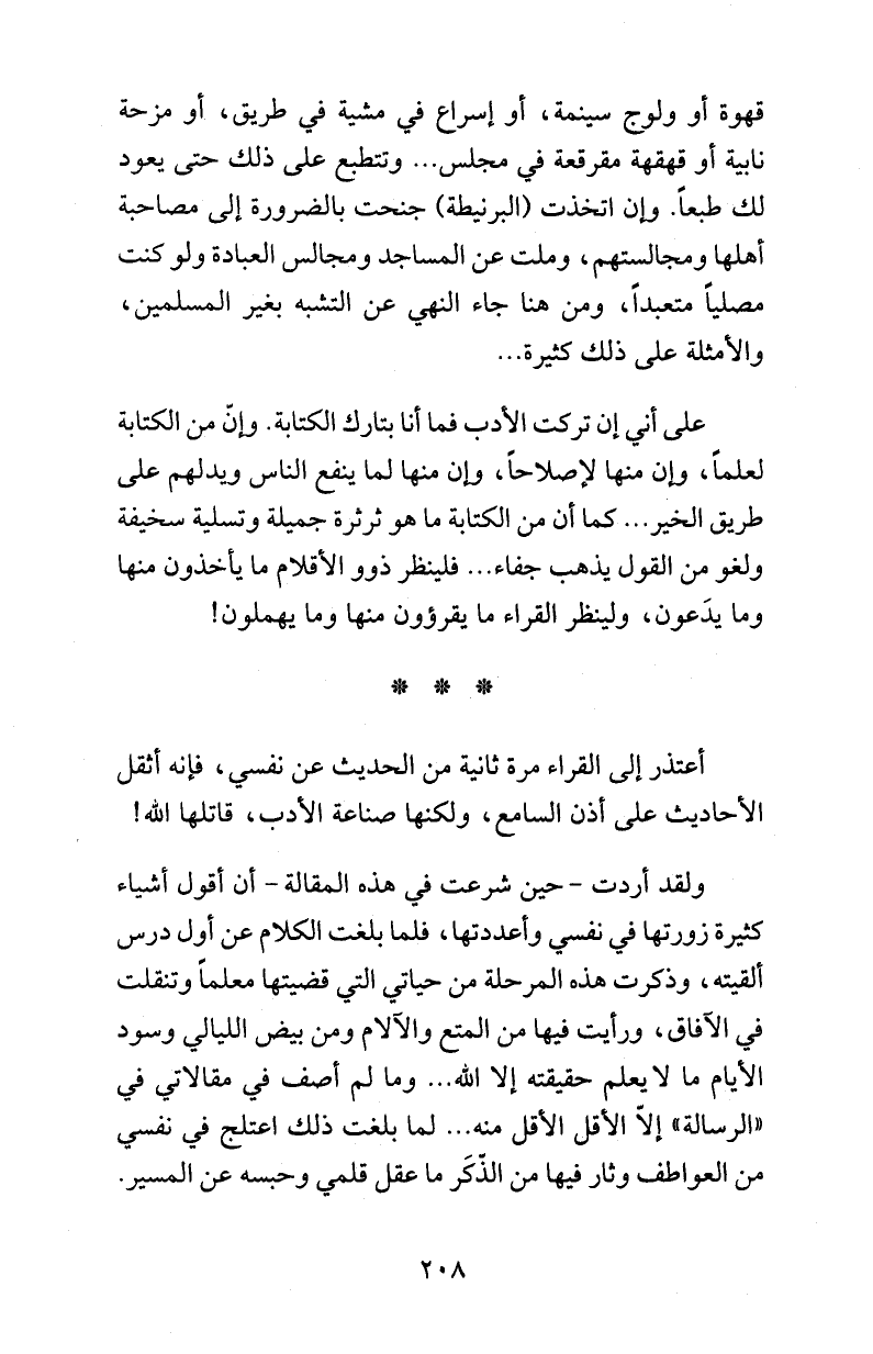 على أني إن تركت الأدب فما أنا بتارك الكتابة. وإنّ من الكتابة لعلماً، وإن منها لإصلاحاً، وإن منها لما ينفع الناس ويدلهم على طريق الخير ... كما أن من الكتابة ما هو ثرثرة جميلة وتسلية سخيفة ولغو من القول يذهب جفاء ... فلينظر ذوو الأقلام ما يأخذون منها وما يدَعون، ولينظر القراء ما يقرؤون منها وما يهملون!