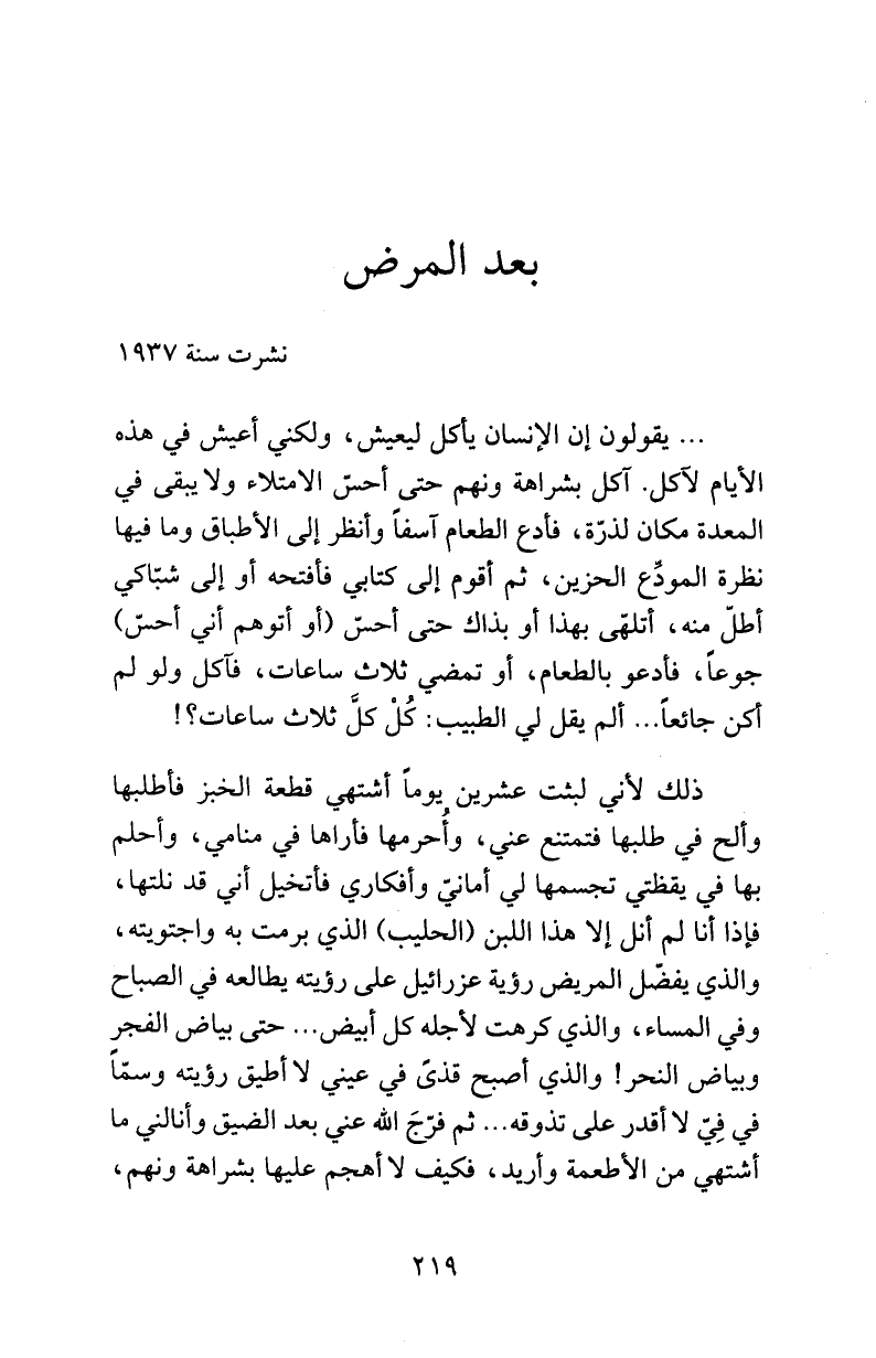 ... يقولون إن الإنسان يأكل ليعيش، ولكني أعيش في هذه الأيام لآكل. آكل بشراهة ونهم حتى أحسّ الامتلاء ولا يبقى في المعدة مكان لذرّة، فأدع الطعام آسفاً وأنظر إلى الأطباق وما فيها نظرة المودِّع الحزين، ثم أقوم إلى كتابي فأفتحه أو إلى شبّاكي أطلّ منه، أتلهّى بهذا أو بذاك حتى أحسّ (أو أتوهم أني أحسّ) جوعاً، فأدعو بالطعام، أو تمضي ثلاث ساعات، فآكل ولو لم أكن جائعاً ... ألم يقل لي الطبيب: كُلْ كلَّ ثلاث ساعات؟!