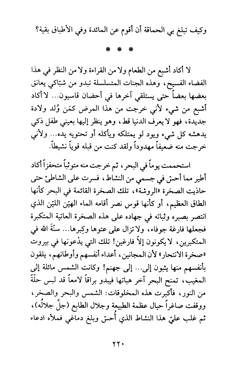 استحممت يوماً في البحر، ثم خرجت منه متوثباً متحفزاً أكاد أطير مما أحسّ في جسمي من النشاط، فسرت على الشاطئ حتى حاذيت الصخرة «الروشة»، تلك الصخرة القائمة في البحر كأنها الطاق العظيم، أو كأنها قوس نصر أقامه الماء الهيّن الليّن الذي انتصر بصبره وثباته في جهاده على هذه الصخرة العاتية المتكبرة فجعلها فارغة جوفاء، ولا تزال على عتوها وكِبرها ... سنّةَ الله في المتكبرين، لا يكونون إلاّ فارغين! تلك التي يدْعونها في بيروت «صخرة الانتحار» لأن المجانين، أعداء أنفسهم وأوطانهم، يلقون بأنفسهم منها يثبون إلى ... إلى جهنم! وكانت الشمس مائلة إلى المغيب، تمنح البحر آخر هباتها فيبدو براقاً لامعاً قد لبس حلّةً من النور، فأكبرت هذه المخلوقات: الشمس والبحر والصخر، ووقفت صاغراً حيال عظمة الطبيعة وجلال الطابع (جلَّ جلالُه)، ثم غلب عليّ هذا النشاط الذي أُحسّ وبلغ دماغي فملأه ادعاء