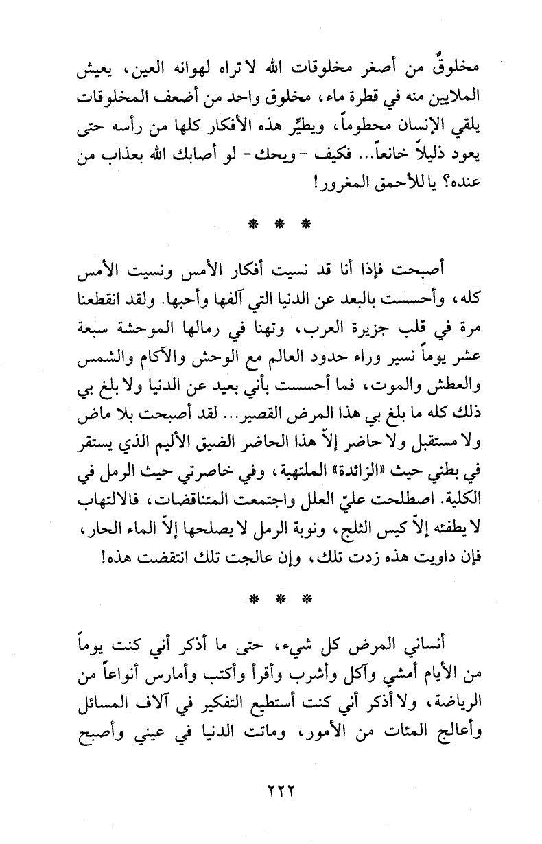 أصبحت فإذا أنا قد نسيت أفكار الأمس ونسيت الأمس كله، وأحسست بالبعد عن الدنيا التي آلفها وأحبها. ولقد انقطعنا مرة في قلب جزيرة العرب، وتهنا في رمالها الموحشة سبعة عشر يوماً نسير وراء حدود العالم مع الوحش والآكام والشمس والعطش والموت، فما أحسست بأني بعيد عن الدنيا ولا بلغ بي ذلك كله ما بلغ بي هذا المرض القصير ... لقد أصبحت بلا ماض ولا مستقبل ولا حاضر إلاّ هذا الحاضر الضيق الأليم الذي يستقر في بطني حيث «الزائدة» الملتهبة، وفي خاصرتي حيث الرمل في الكلية. اصطلحت عليّ العلل واجتمعت المتناقضات، فالالتهاب لا يطفئه إلاّ كيس الثلج، ونوبة الرمل لا يصلحها إلاّ الماء الحار، فإن داويت هذه زدت تلك، وإن عالجت تلك انتقضت هذه!