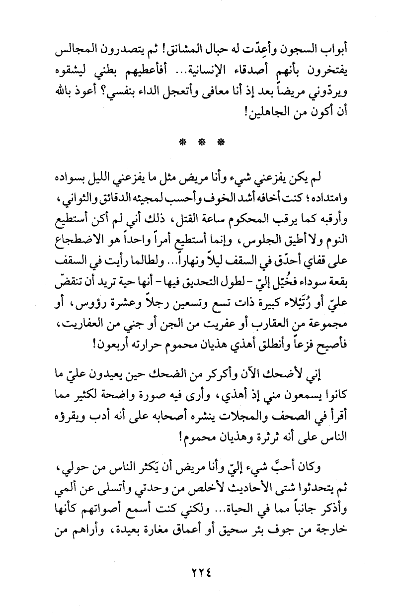 لم يكن يفزعني شيء وأنا مريض مثل ما يفزعني الليل بسواده وامتداده؛ كنت أخافه أشد الخوف وأحسب لمجيئه الدقائق والثواني، وأرقبه كما يرقب المحكوم ساعة القتل، ذلك أني لم أكن أستطيع النوم ولا أطيق الجلوس، وإنما أستطيع أمراً واحداً هو الاضطجاع على قفاي أحدّق في السقف ليلاً ونهاراً ... ولطالما رأيت في السقف بقعة سوداء فخُيّل إليّ -لطول التحديق فيها- أنها حية تريد أن تنقضّ عليّ أو رُتَيْلاء كبيرة ذات تسع وتسعين رجلاً وعشرة رؤوس، أو مجموعة من العقارب أو عفريت من الجن أو جني من العفاريت، فأصيح فزعاً وأنطلق أهذي هذيان محموم حرارته أربعون!