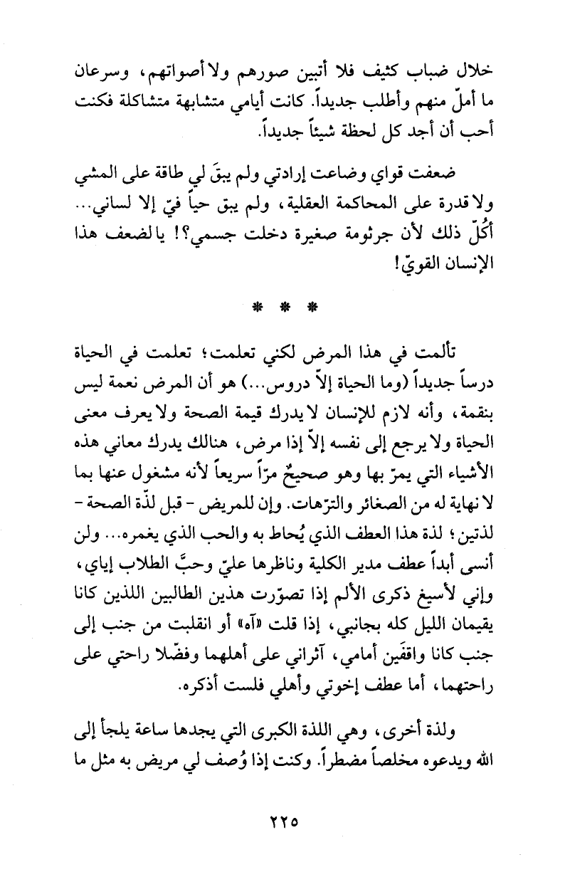 تألمت في هذا المرض لكني تعلمت؛ تعلمت في الحياة درساً جديداً (وما الحياة إلاّ دروس ...) هو أن المرض نعمة ليس بنقمة، وأنه لازم للإنسان لا يدرك قيمة الصحة ولا يعرف معنى الحياة ولا يرجع إلى نفسه إلاّ إذا مرض، هنالك يدرك معاني هذه الأشياء التي يمرّ بها وهو صحيحٌ مرّاً سريعاً لأنه مشغول عنها بما لا نهاية له من الصغائر والترّهات. وإن للمريض -قبل لذّة الصحة- لذتين؛ لذة هذا العطف الذي يُحاط به والحب الذي يغمره ... ولن أنسى أبداً عطف مدير الكلية وناظرها عليّ وحبَّ الطلاب إياي، وإني لأسيغ ذكرى الألم إذا تصوّرت هذين الطالبين اللذين كانا يقيمان الليل كله بجانبي، إذا قلت «آه» أو انقلبت من جنب إلى جنب كانا واقفَين أمامي، آثراني على أهلهما وفضّلا راحتي على راحتهما، أما عطف إخوتي وأهلي فلست أذكره.