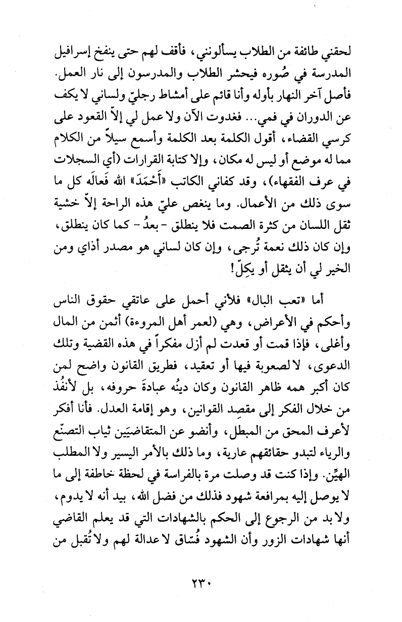 لحقني طائفة من الطلاب يسألونني، فأقف لهم حتى ينفخ إسرافيل المدرسة في صُوره فيحشر الطلاب والمدرسون إلى نار العمل. فأصل آخر النهار بأوله وأنا قائم على أمشاط رجليّ ولساني لا يكف عن الدوران في فمي ... فغدوت الآن ولا عمل لي إلاّ القعود على كرسي القضاء، أقول الكلمة بعد الكلمة وأسمع سيلاً من الكلام مما له موضع أو ليس له مكان، وإلا كتابة القرارات (أي السجلات في عرف الفقهاء)، وقد كفاني الكاتب «أَحْمَدَ» الله فَعالَه كل ما سوى ذلك من الأعمال. وما ينغص عليّ هذه الراحة إلاّ خشية ثقل اللسان من كثرة الصمت فلا ينطلق -بعدُ- كما كان ينطلق، وإن كان ذلك نعمة تُرجى، وإن كان لساني هو مصدر أذاي ومن الخير لي أن يثقل أو يكِلّ!