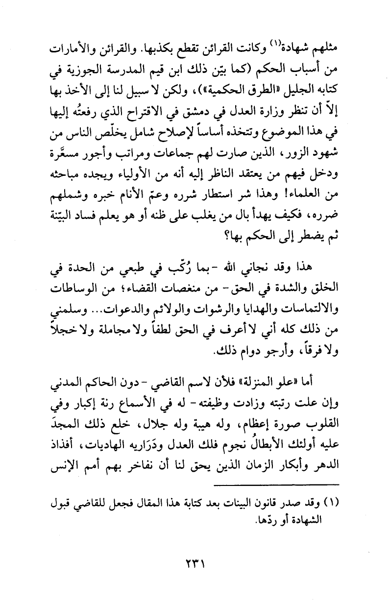 مثلهم شهادة (¬1) وكانت القرائن تقطع بكذبها. والقرائن والأمارات من أسباب الحكم (كما بيّن ذلك ابن قيم المدرسة الجوزية في كتابه الجليل «الطرق الحكمية»)، ولكن لا سبيل لنا إلى الأخذ بها إلاّ أن تنظر وزارة العدل في دمشق في الاقتراح الذي رفعتُه إليها في هذا الموضوع وتتخذه أساساً لإصلاح شامل يخلّص الناس من شهود الزور، الذين صارت لهم جماعات ومراتب وأجور مسعَّرة ودخل فيهم من يعتقد الناظر إليه أنه من الأولياء ويجده مباحثه من العلماء! وهذا شر استطار شرره وعمّ الأنام خبره وشملهم ضرره، فكيف يهدأ بال من يغلب على ظنه أو هو يعلم فساد البيّنة ثم يضطر إلى الحكم بها؟
