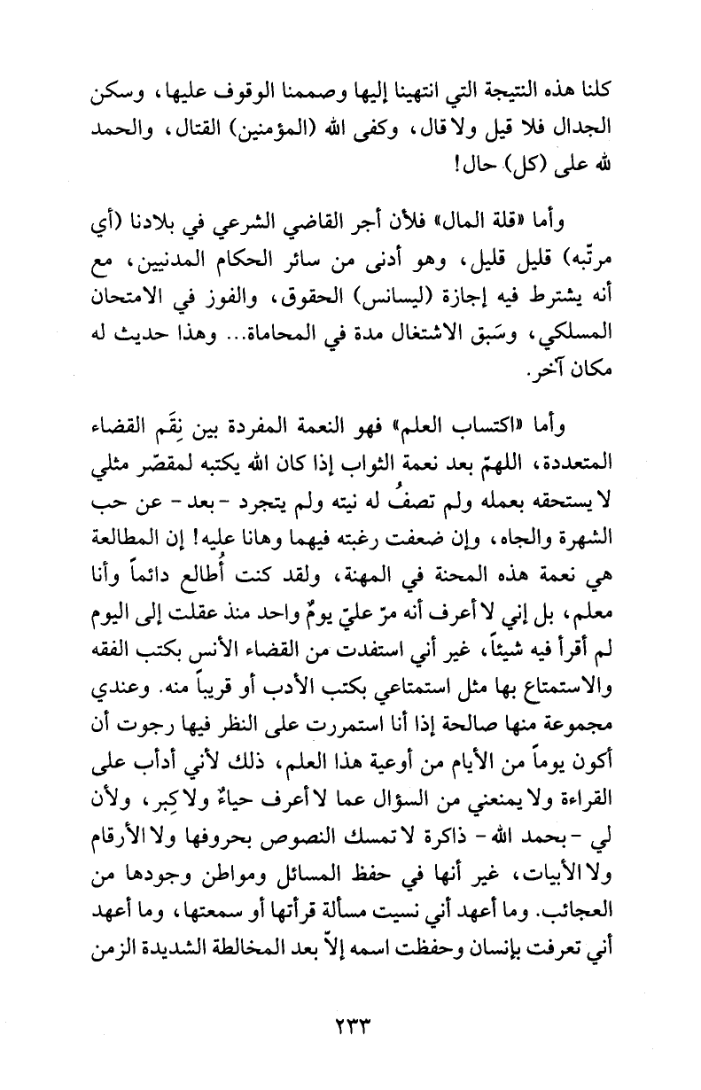 وأما «اكتساب العلم» فهو النعمة المفردة بين نِقَم القضاء المتعددة، اللهمّ بعد نعمة الثواب إذا كان الله يكتبه لمقصّر مثلي لا يستحقه بعمله ولم تصفُ له نيته ولم يتجرد -بعد- عن حب الشهرة والجاه، وإن ضعفت رغبته فيهما وهانا عليه! إن المطالعة هي نعمة هذه المحنة في المهنة، ولقد كنت أُطالع دائماً وأنا معلم، بل إني لا أعرف أنه مرّ عليّ يومٌ واحد منذ عقلت إلى اليوم لم أقرأ فيه شيئاً، غير أني استفدت من القضاء الأنس بكتب الفقه والاستمتاع بها مثل استمتاعي بكتب الأدب أو قريباً منه. وعندي مجموعة منها صالحة إذا أنا استمررت على النظر فيها رجوت أن أكون يوماً من الأيام من أوعية هذا العلم، ذلك لأني أدأب على القراءة ولا يمنعني من السؤال عما لا أعرف حياءٌ ولا كِبر، ولأن لي -بحمد الله- ذاكرة لا تمسك النصوص بحروفها ولا الأرقام ولا الأبيات، غير أنها في حفظ المسائل ومواطن وجودها من العجائب. وما أعهد أني نسيت مسألة قرأتها أو سمعتها، وما أعهد أني تعرفت بإنسان وحفظت اسمه إلاّ بعد المخالطة الشديدة الزمن
