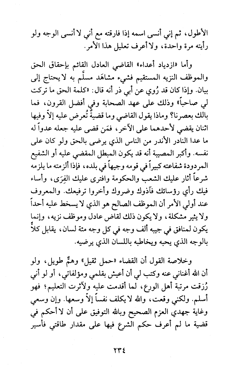 وخلاصة القول أن القضاء «حمل ثقيل» وهمٌّ طويل، ولو أن الله أغناني عنه وكتب لي أن أعيش بقلمي ومؤلفاتي، أو لو أني رُزقت مرتبة أهل الورع، لما أقدمت عليه ولآثرت التعليم؛ فهو أسلم. ولكني وقعت، والله لا يكلف نفساً إلاّ وسعها. وإن وسعي وغاية جهدي العزم الصحيح وبالله التوفيق على أن لا أحكم في قضية ما لم أعرف حكم الشرع فيها على مقدار طاقتي فأسير