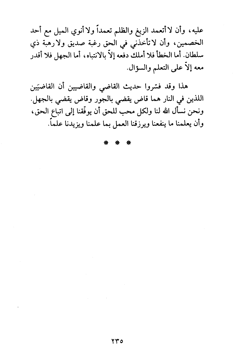 عليه، وأن لا أتعمد الزيغ والظلم تعمداً ولا أنوي الميل مع أحد الخصمين، وأن لا تأخذني في الحق رغبة صديق ولا رهبة ذي سلطان. أما الخطأ فلا أملك دفعه إلاّ بالانتباه، أما الجهل فلا أقدر معه إلاّ على التعلم والسؤال.