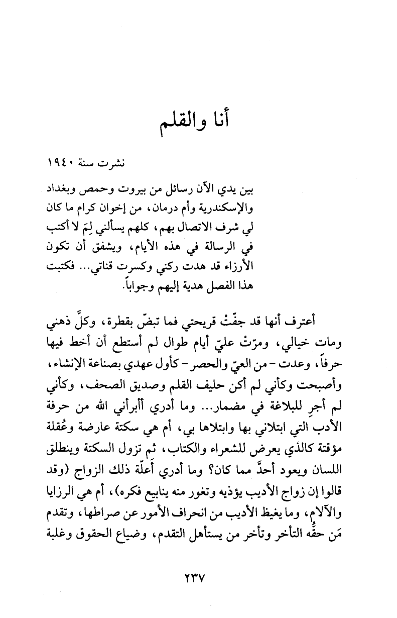أعترف أنها قد جفّتْ قريحتي فما تبضّ بقطرة، وكلَّ ذهني ومات خيالي، ومرّتْ عليّ أيام طوال لم أستطع أن أخط فيها حرفاً، وعدت -من العيّ والحصر- كأول عهدي بصناعة الإنشاء، وأصبحت وكأني لم أكن حليف القلم وصديق الصحف، وكأني لم أجرِ للبلاغة في مضمار ... وما أدري أأبرأني الله من حرفة الأدب التي ابتلاني بها وابتلاها بي، أم هي سكتة عارضة وعُقلة مؤقتة كالذي يعرض للشعراء والكتاب، ثم تزول السكتة وينطلق اللسان ويعود أحدَّ مما كان؟ وما أدري أَعلّة ذلك الزواج (وقد قالوا إن زواج الأديب يؤذيه وتغور منه ينابيع فكره)، أم هي الرزايا والآلام، وما يغيظ الأديب من انحراف الأمور عن صراطها، وتقدم مَن حقُّه التأخر وتأخر من يستأهل التقدم، وضياع الحقوق وغلبة
