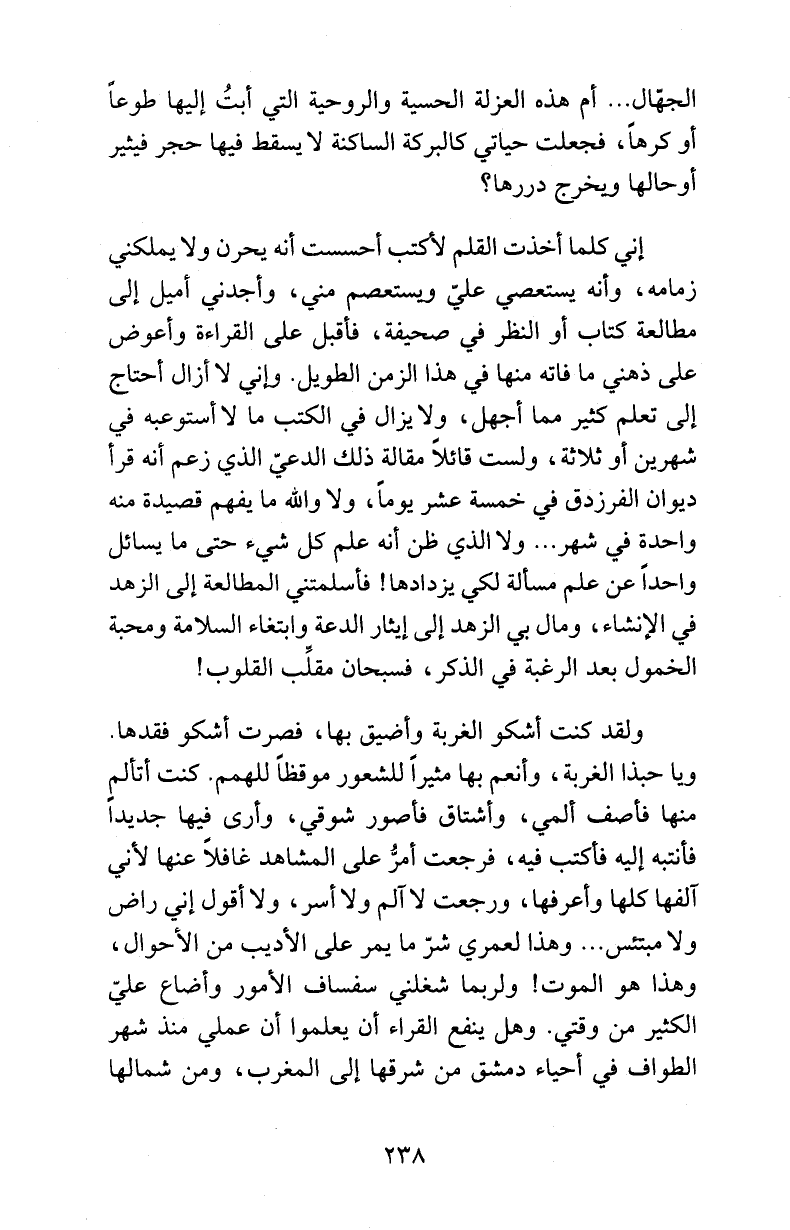 إني كلما أخذت القلم لأكتب أحسست أنه يحرن ولا يملكني زمامه، وأنه يستعصي عليّ ويستعصم مني، وأجدني أميل إلى مطالعة كتاب أو النظر في صحيفة، فأقبل على القراءة وأعوض على ذهني ما فاته منها في هذا الزمن الطويل. وإني لا أزال أحتاج إلى تعلم كثير مما أجهل، ولا يزال في الكتب ما لا أستوعبه في شهرين أو ثلاثة، ولست قائلاً مقالة ذلك الدعيّ الذي زعم أنه قرأ ديوان الفرزدق في خمسة عشر يوماً، ولا والله ما يفهم قصيدة منه واحدة في شهر ... ولا الذي ظن أنه علم كل شيء حتى ما يسائل واحداً عن علم مسألة لكي يزدادها! فأسلمتني المطالعة إلى الزهد في الإنشاء، ومال بي الزهد إلى إيثار الدعة وابتغاء السلامة ومحبة الخمول بعد الرغبة في الذكر، فسبحان مقلِّب القلوب!