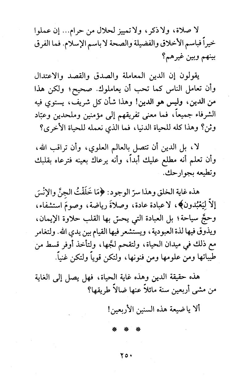 هذه غاية الخلق وهذا سرّ الوجود: {مَا خَلَقْتُ الجِنَّ والإنْسَ إلاّ لِيَعْبُدون}، لا عبادة عادة، وصلاةَ رياضة، وصومَ استشفاء، وحجَّ سياحة؛ بل العبادة التي يحسّ بها القلب حلاوة الإيمان، ويذوق فيها لذة العبودية، ويستشعر فيها القيام بين يدي الله. ولتغامر مع ذلك في ميدان الحياة، ولتقحم لجَّها، ولتأخذ أوفر قسط من طيباتها ومن علومها ومن فنونها، ولتكن قوياً ولتكن غنياً.