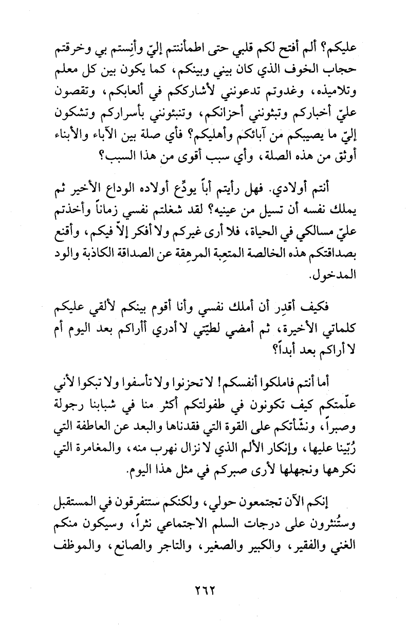 أنتم أولادي. فهل رأيتم أباً يودِّع أولاده الوداع الأخير ثم يملك نفسه أن تسيل من عينيه؟ لقد شغلتم نفسي زماناً وأخذتم عليّ مسالكي في الحياة، فلا أرى غيركم ولا أفكر إلاّ فيكم، وأقنع بصداقتكم هذه الخالصة المتعِبة المرهِقة عن الصداقة الكاذبة والود المدخول.