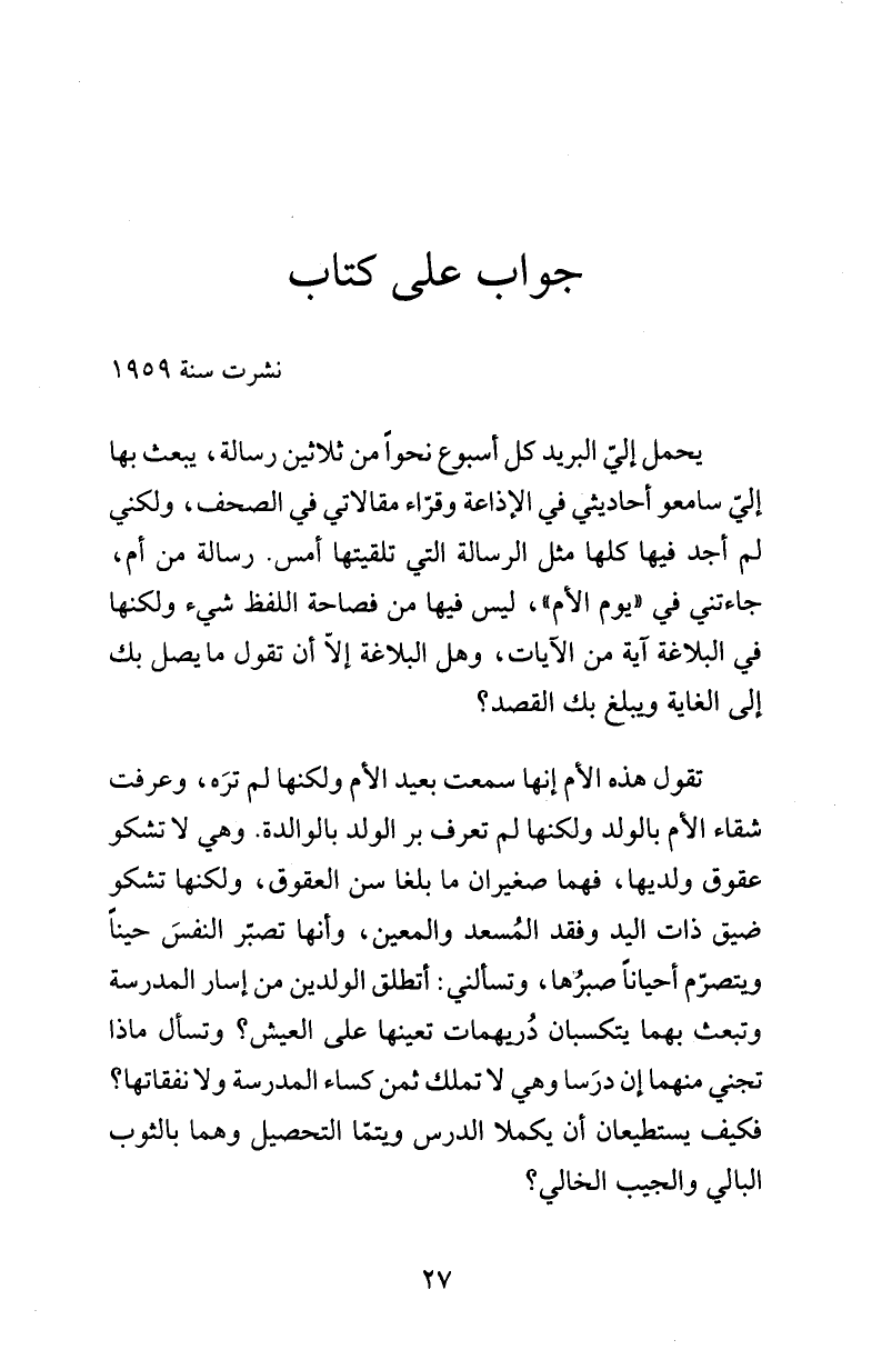 يحمل إليّ البريد كل أسبوع نحواً من ثلاثين رسالة، يبعث بها إليّ سامعو أحاديثي في الإذاعة وقرّاء مقالاتي في الصحف، ولكني لم أجد فيها كلها مثل الرسالة التي تلقيتها أمس. رسالة من أم، جاءتني في «يوم الأم»، ليس فيها من فصاحة اللفظ شيء ولكنها في البلاغة آية من الآيات، وهل البلاغة إلاّ أن تقول ما يصل بك إلى الغاية ويبلغ بك القصد؟