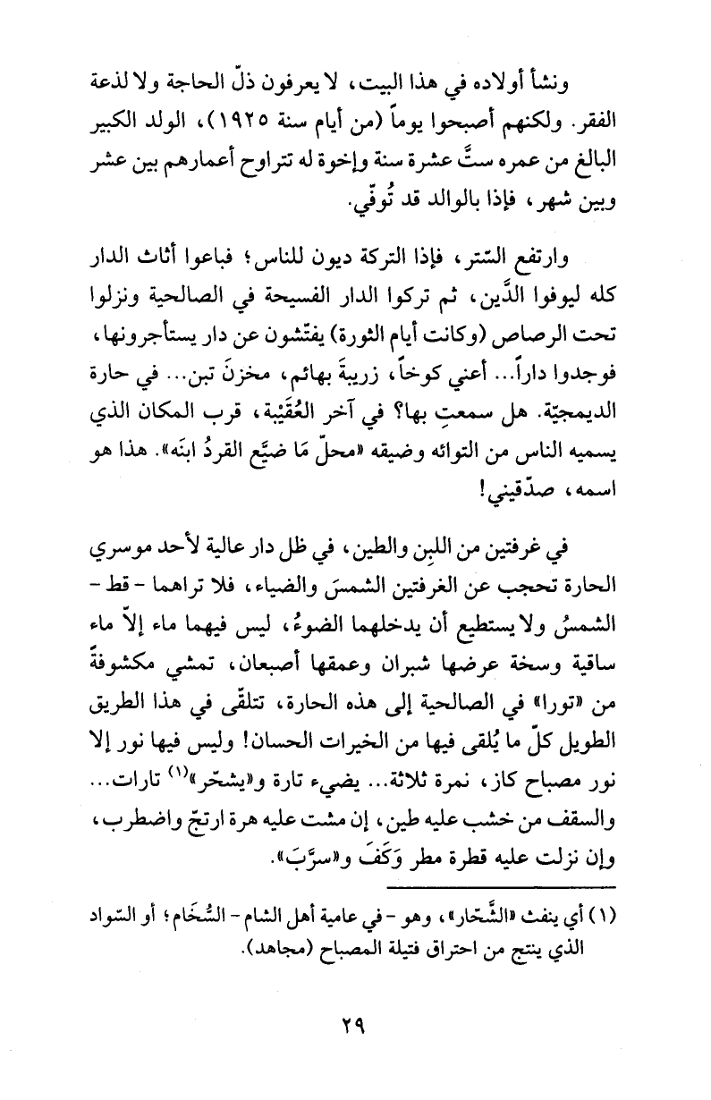 في غرفتين من اللبِن والطين، في ظل دار عالية لأحد موسري الحارة تحجب عن الغرفتين الشمسَ والضياء، فلا تراهما -قط- الشمسُ ولا يستطيع أن يدخلهما الضوءُ، ليس فيهما ماء إلاّ ماء ساقية وسخة عرضها شبران وعمقها أصبعان، تمشي مكشوفةً من «تورا» في الصالحية إلى هذه الحارة، تتلقّى في هذا الطريق الطويل كلّ ما يُلقى فيها من الخيرات الحسان! وليس فيها نور إلا نور مصباح كاز، نمرة ثلاثة ... يضيء تارة و «يشحّر» (¬1) تارات ... والسقف من خشب عليه طين، إن مشت عليه هرة ارتجّ واضطرب، وإن نزلت عليه قطرة مطر وَكَفَ و «سرَّبَ».