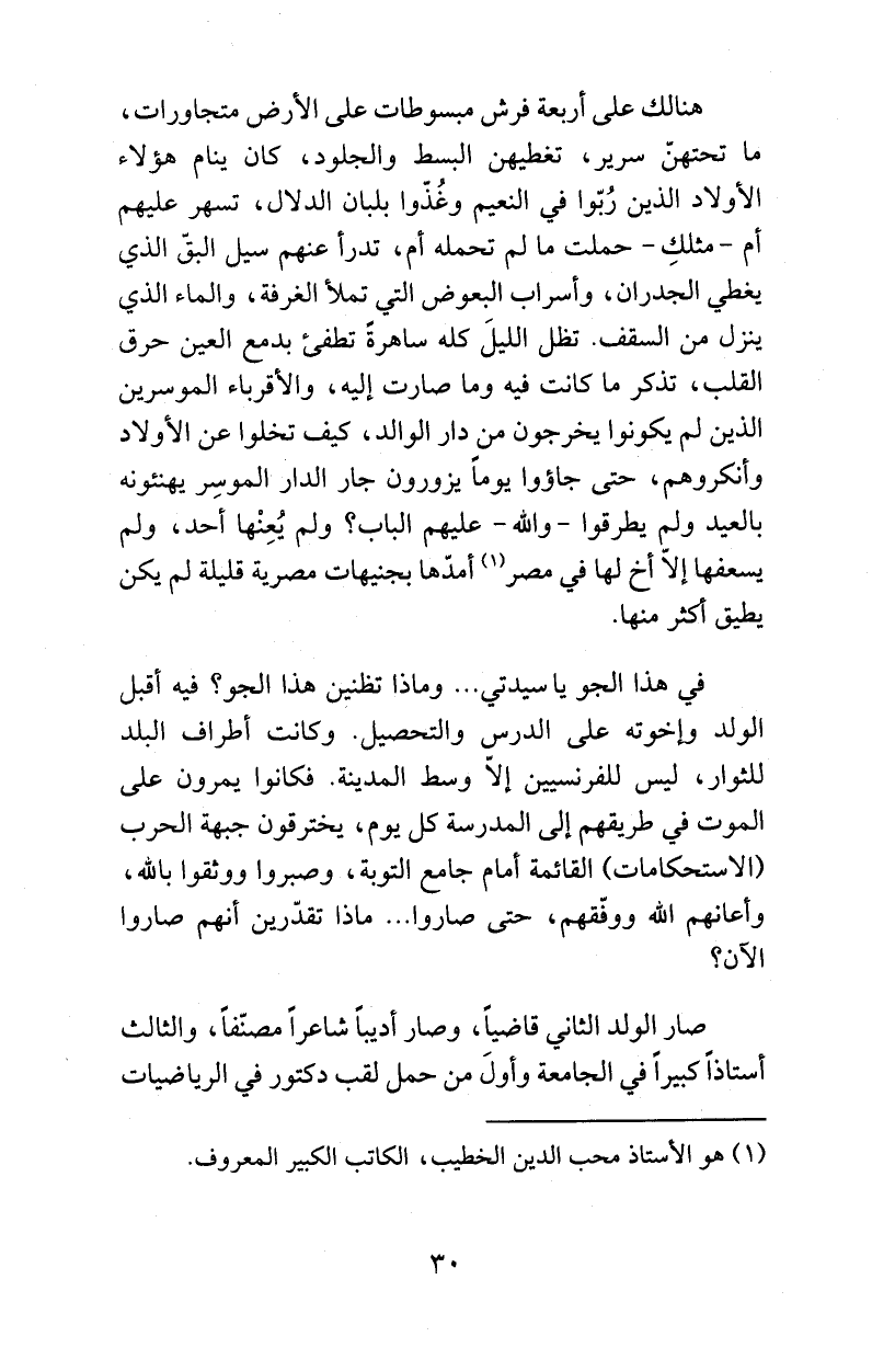 هنالك على أربعة فرش مبسوطات على الأرض متجاورات، ما تحتهنّ سرير، تغطيهن البسط والجلود، كان ينام هؤلاء الأولاد الذين رُبّوا في النعيم وغُذّوا بلبان الدلال، تسهر عليهم أم -مثلكِ- حملت ما لم تحمله أم، تدرأ عنهم سيل البقّ الذي يغطي الجدران، وأسراب البعوض التي تملأ الغرفة، والماء الذي ينزل من السقف. تظل الليلَ كله ساهرةً تطفئ بدمع العين حرق القلب، تذكر ما كانت فيه وما صارت إليه، والأقرباء الموسرين الذين لم يكونوا يخرجون من دار الوالد، كيف تخلوا عن الأولاد وأنكروهم، حتى جاؤوا يوماً يزورون جار الدار الموسِر يهنئونه بالعيد ولم يطرقوا -والله- عليهم الباب؟ ولم يُعِنْها أحد، ولم يسعفها إلاّ أخ لها في مصر (¬1) أمدّها بجنيهات مصرية قليلة لم يكن يطيق أكثر منها.