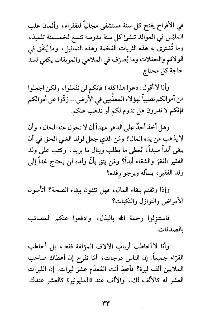 وأنا لا أخاطب أرباب الآلاف المؤلفة فقط، بل أخاطب القرّاء جميعاً. إن الناس درجات؛ أمَا تفرح إن أعطاك صاحب الملايين ألف ليرة؟ فأعطِ أنت المُعدَم عشرَ ليرات. إن الليرات العشر له كالألف لك، والألف عند «المليونير» كالعشر عندك.