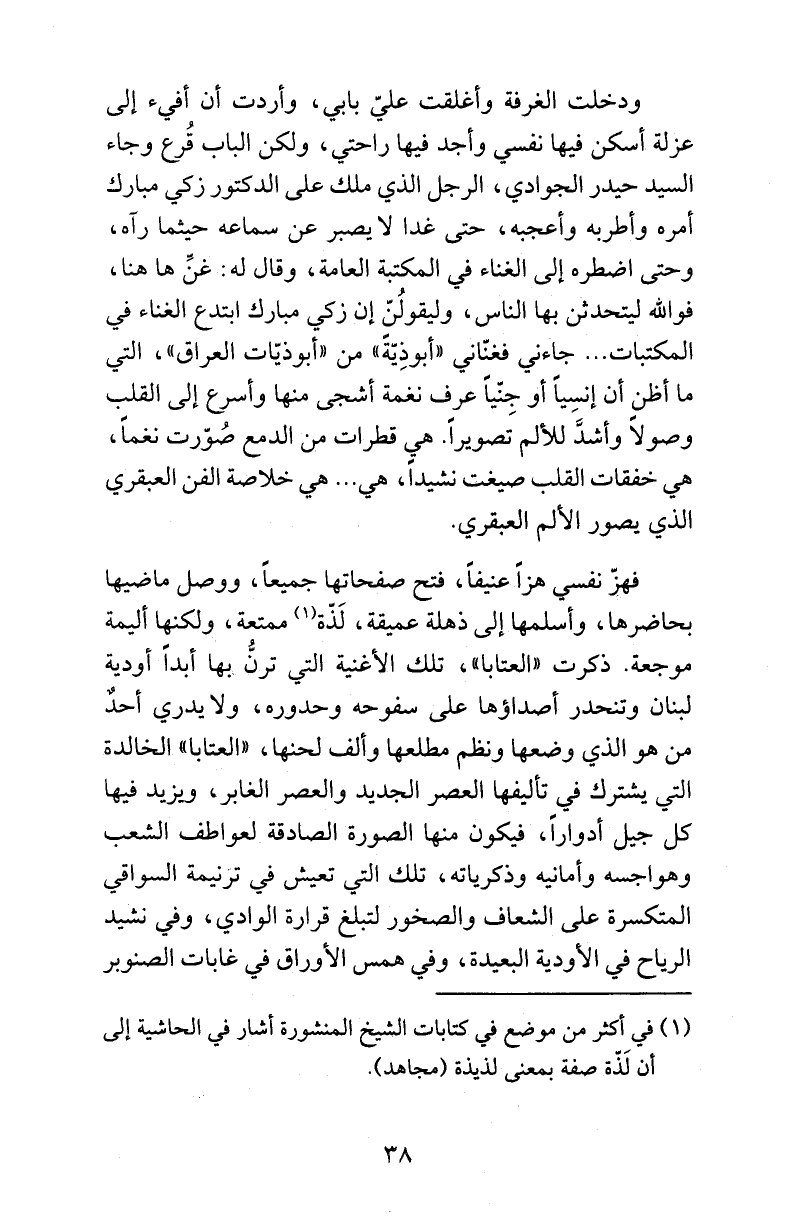 ودخلت الغرفة وأغلقت عليّ بابي، وأردت أن أفيء إلى عزلة أسكن فيها نفسي وأجد فيها راحتي، ولكن الباب قُرع وجاء السيد حيدر الجوادي، الرجل الذي ملك على الدكتور زكي مبارك أمره وأطربه وأعجبه، حتى غدا لا يصبر عن سماعه حيثما رآه، وحتى اضطره إلى الغناء في المكتبة العامة، وقال له: غنِّ ها هنا، فوالله ليتحدثن بها الناس، وليقولُنّ إن زكي مبارك ابتدع الغناء في المكتبات ... جاءني فغنّاني «أبوذِيّةً» من «أبوذيّات العراق»، التي ما أظن أن إنسِياً أو جِنّياً عرف نغمة أشجى منها وأسرع إلى القلب وصولاً وأشدَّ للألم تصويراً. هي قطرات من الدمع صُوّرت نغماً، هي خفقات القلب صيغت نشيداً، هي ... هي خلاصة الفن العبقري الذي يصور الألم العبقري.