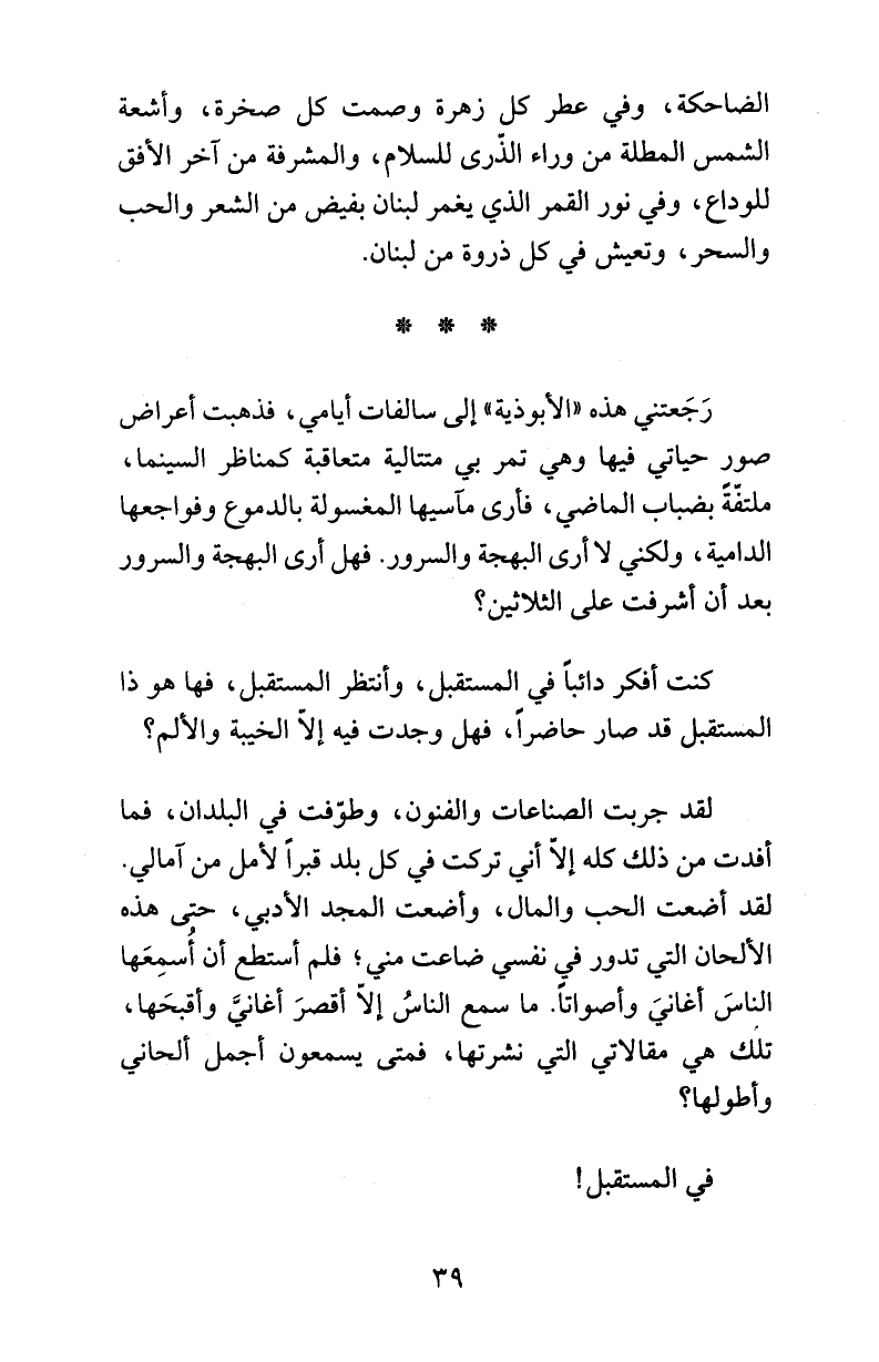 لقد جربت الصناعات والفنون، وطوّفت في البلدان، فما أفدت من ذلك كله إلاّ أني تركت في كل بلد قبراً لأمل من آمالي. لقد أضعت الحب والمال، وأضعت المجد الأدبي، حتى هذه الألحان التي تدور في نفسي ضاعت مني؛ فلم أستطع أن أُسمِعَها الناسَ أغانيَ وأصواتاً. ما سمع الناسُ إلاّ أقصرَ أغانيَّ وأقبحَها، تلك هي مقالاتي التي نشرتها، فمتى يسمعون أجمل ألحاني وأطولها؟