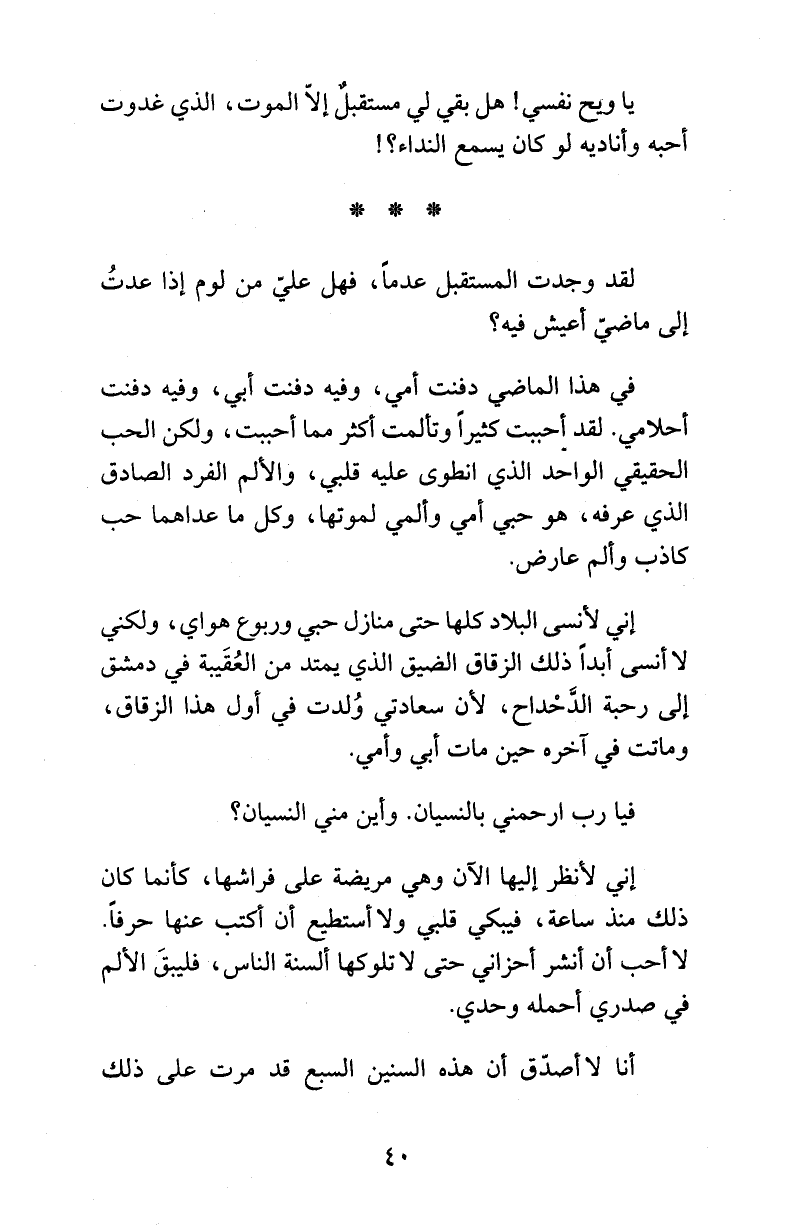 إني لأنسى البلاد كلها حتى منازل حبي وربوع هواي، ولكني لا أنسى أبداً ذلك الزقاق الضيق الذي يمتد من العُقَيبة في دمشق إلى رحبة الدَّحْداح، لأن سعادتي وُلدت في أول هذا الزقاق، وماتت في آخره حين مات أبي وأمي.
