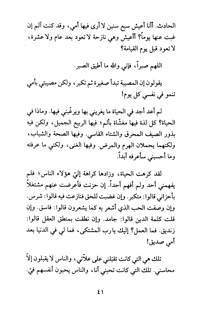 لقد كرهت الحياة، وزادها كراهة إليّ هؤلاء الناس؛ فلم يفهمني أحد ولم أفهم أحداً. إن حزنت فأعرضت عنهم مشتغلاً بأحزاني قالوا: متكبر. وإن غضبت للحق فنازعت فيه قالوا: شرس. وإن وصفت الحب الذي أشعر به كما يشعرون قالوا: فاسق. وإن قلت كلمة الدين قالوا: جامد. وإن نطقت بمنطق العقل قالوا: زنديق. فما العمل؟ إليك يا رب المشتكى، فما لي في الدنيا بعد أمي صديق!