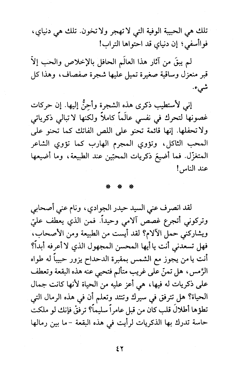 إني لأستطيب ذكرى هذه الشجرة وأحِنُّ إليها. إن حركات غصونها لتحرك في نفسي عالَماً كاملاً ولكنها لا تبالي ذكرياتي ولا تحفلها. إنها قائمة تحنو على اللص الفاتك كما تحنو على المحب الثاكل، وتؤوي المجرم الهارب كما تؤوي الشاعر المتغزّل. فما أضيعَ ذكريات المحبّين عند الطبيعة، وما أضيعها عند الناس!