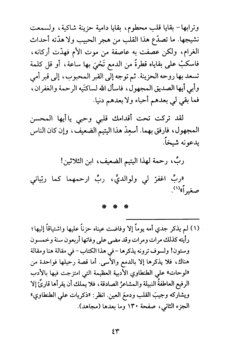 (¬1) لم يذكر جدي أمه يوماً إلا وفاضت عيناه حزناً عليها واشتياقاً إليها؛ رأيته كذلك مرات ومرات وقد مضى على وفاتها أربعون سنة وخمسون وستون! ولسوف ترونه يذكرها -في هذا الكتاب- في مقالة هنا ومقالة هناك، فلا يذكرها إلا بالدمع والأسى. أما قصة رحيلها فواحدة من «لوحات» علي الطنطاوي الأدبية العظيمة التي امتزجت فيها بالأدب الرفيع العاطفةُ النبيلة والمشاعرُ الصادقة، فلا يملك أن يقرأها قارئٌ إلا ويشاركه وجيبَ القلب ودمعَ العين. انظر: «ذكريات علي الطنطاوي» الجزء الثاني، صفحة 130 وما بعدها (مجاهد).
