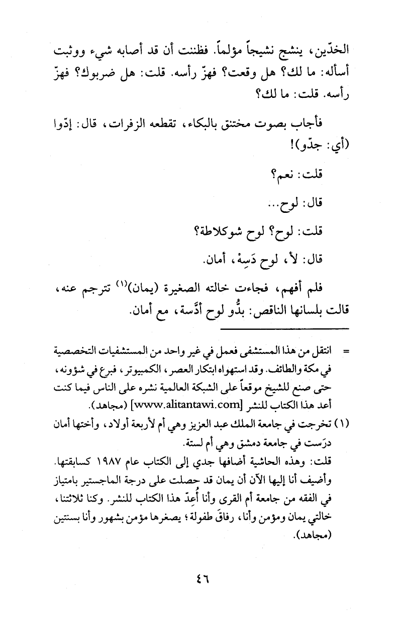 قلت: وهذه الحاشية أضافها جدي إلى الكتاب عام 1987 كسابقتها. وأضيف أنا إليها الآن أن يمان قد حصلت على درجة الماجستير بامتياز في الفقه من جامعة أم القرى وأنا أُعِدّ هذا الكتاب للنشر. وكنا ثلاثتنا، خالتي يمان ومؤمن وأنا، رفاقَ طفولة؛ يصغرها مؤمن بشهور وأنا بسنتين (مجاهد).