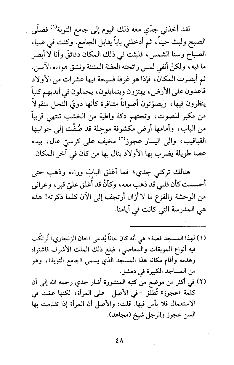 لقد أخذني جدّي معه ذلك اليوم إلى جامع التوبة (¬1) فصلّى الصبح ولبث حيناً، ثم أدخلني باباً يقابل الجامع. وكنت في ضياء الصباح وسنا الشمس، فلبثت في ذلك المكان دقائقَ وأنا لا أبصر ما فيه، ولكنّ أنفي لمس رائحته العفنة المنتنة ونشق هواءه الآسن. ثم أبصرت المكان، فإذا هو غرفة فسيحة فيها عشرات من الأولاد قاعدون على الأرض، يهتزون ويتمايلون، يحملون في أيديهم كتباً ينظرون فيها، ويصوّتون أصواتاً متنافرة كأنها دويّ النحل منقولاً من مكبر للصوت، وتحتهم دكة واطية من الخشب تنتهي قريباً من الباب، وأمامها أرض مكشوفة موحِلة قد صُفّت إلى جوانبها القباقيب، والى اليسار عجوز (¬2) مخيف على كرسيّ عال، بيده عصا طويلة يضرب بها الأولاد ينال بها من كان في آخر المكان.