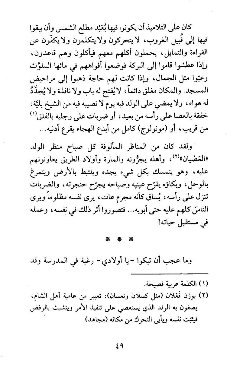 ولقد كان من المناظر المألوفة كل صباح منظر الولد «العَصْيان» (¬2)، وأهله يجرُّونه والمارة وأولاد الطريق يعاونونهم عليه، وهو يتمسك بكل شيء يجده ويلتبط بالأرض ويتمرغ بالوحل، وبكاؤه يقرّح عينيه وصياحه يجرّح حنجرته، والضربات تنزل على رأسه، يُساق كأنه مجرم عات، يرى نفسه مظلوماً ويرى الناسَ كلهم عليه حتى أبويه ... فتصوروا أثر ذلك في نفسه، وعمله في مستقبل حياته!